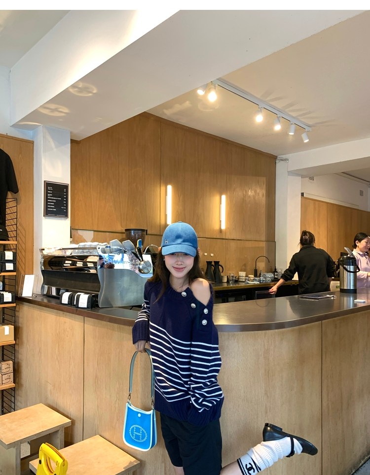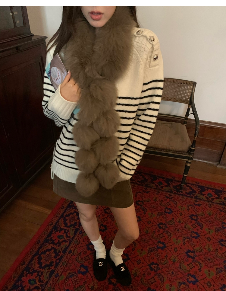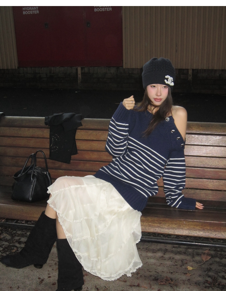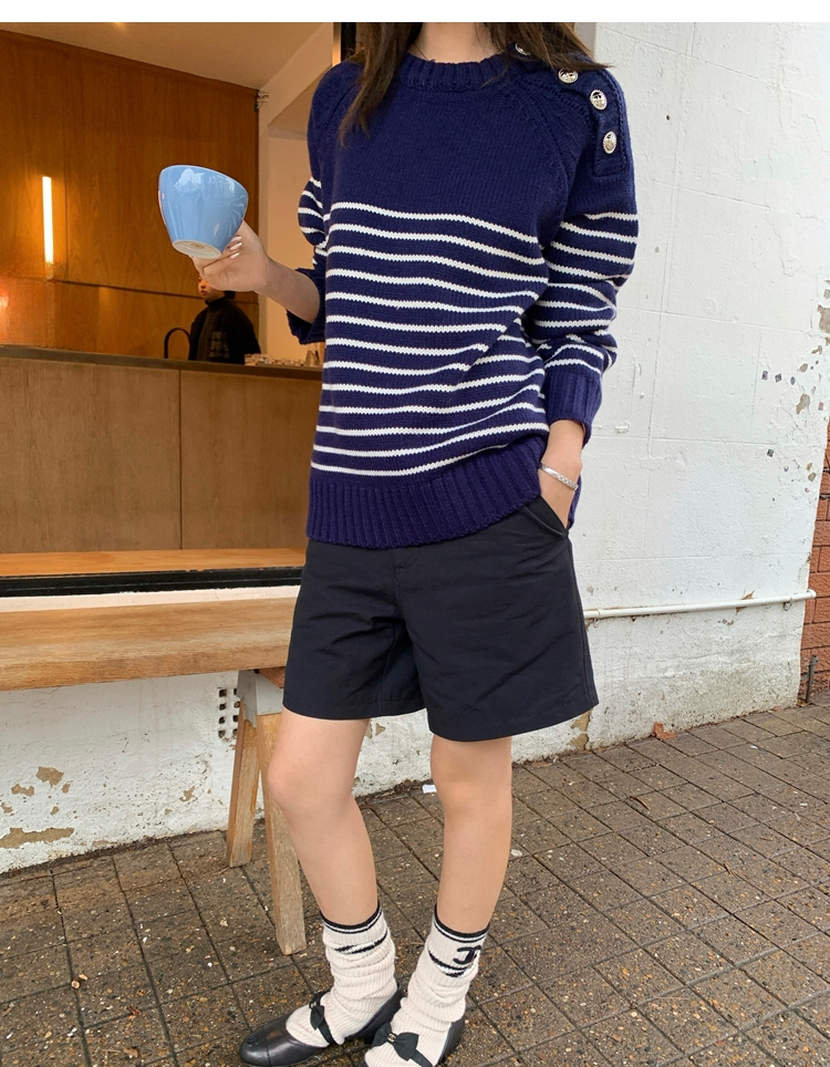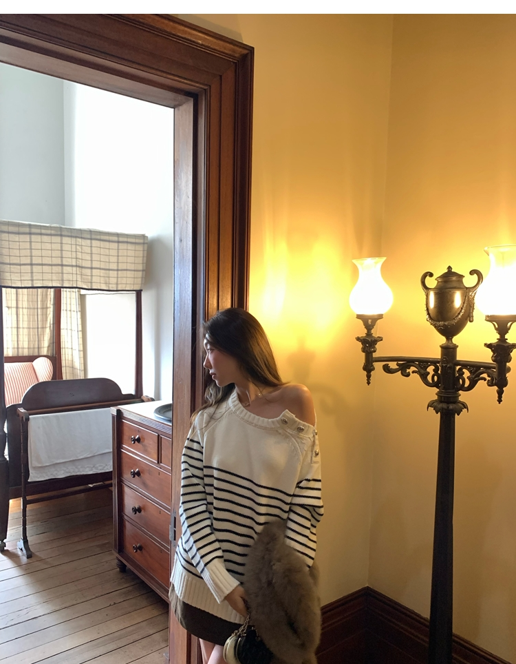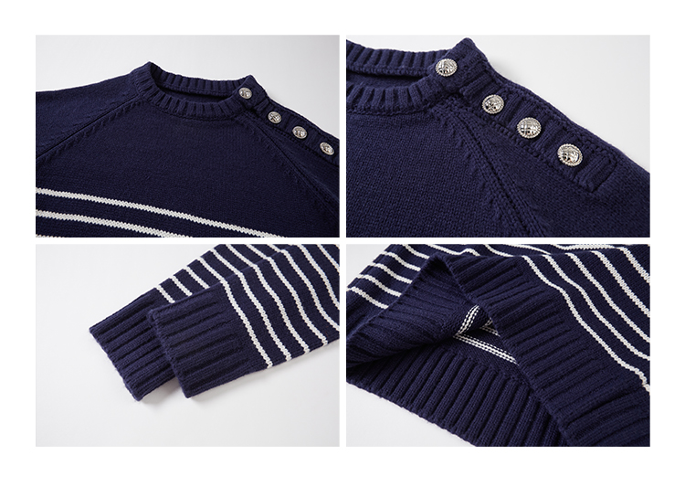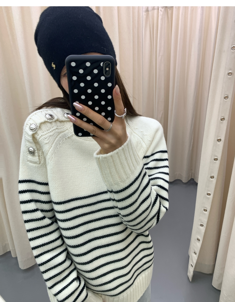 Autumn Winter Contrast Striped Shoulder Button Thick Sweater