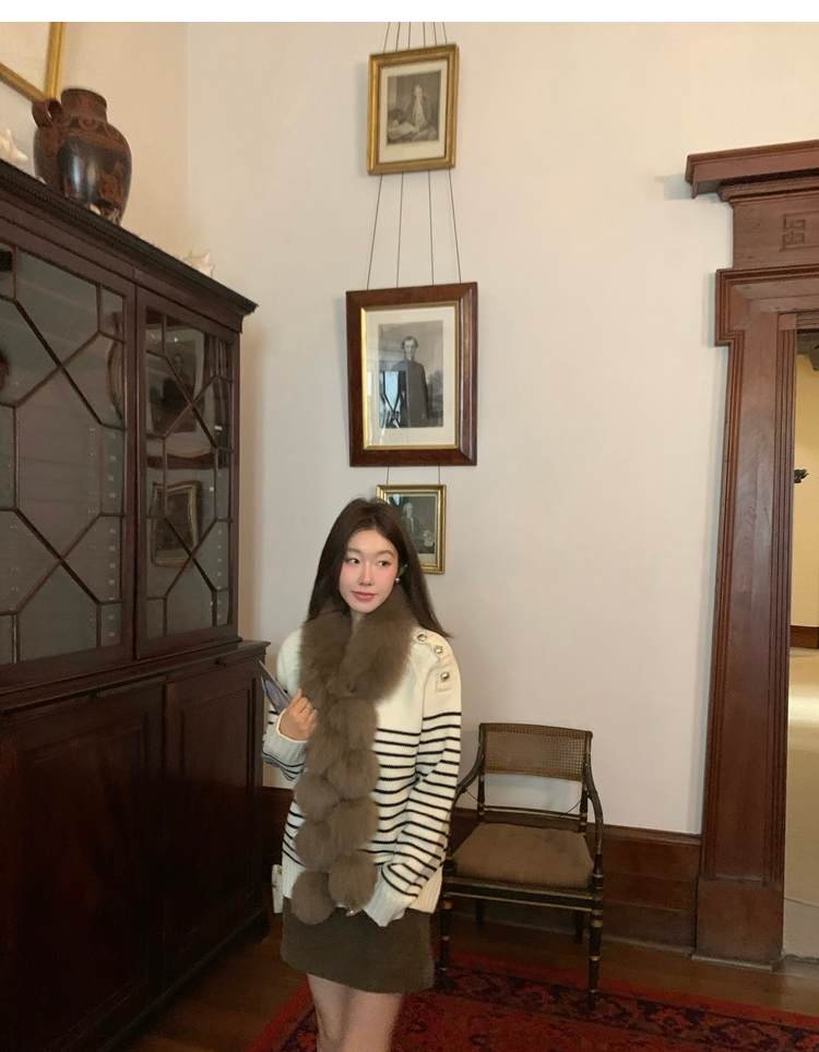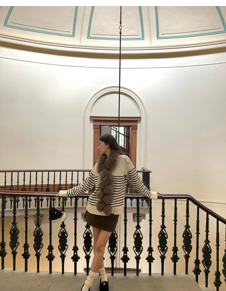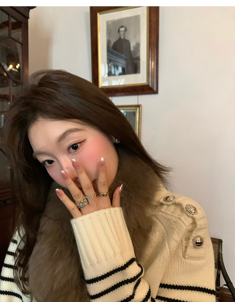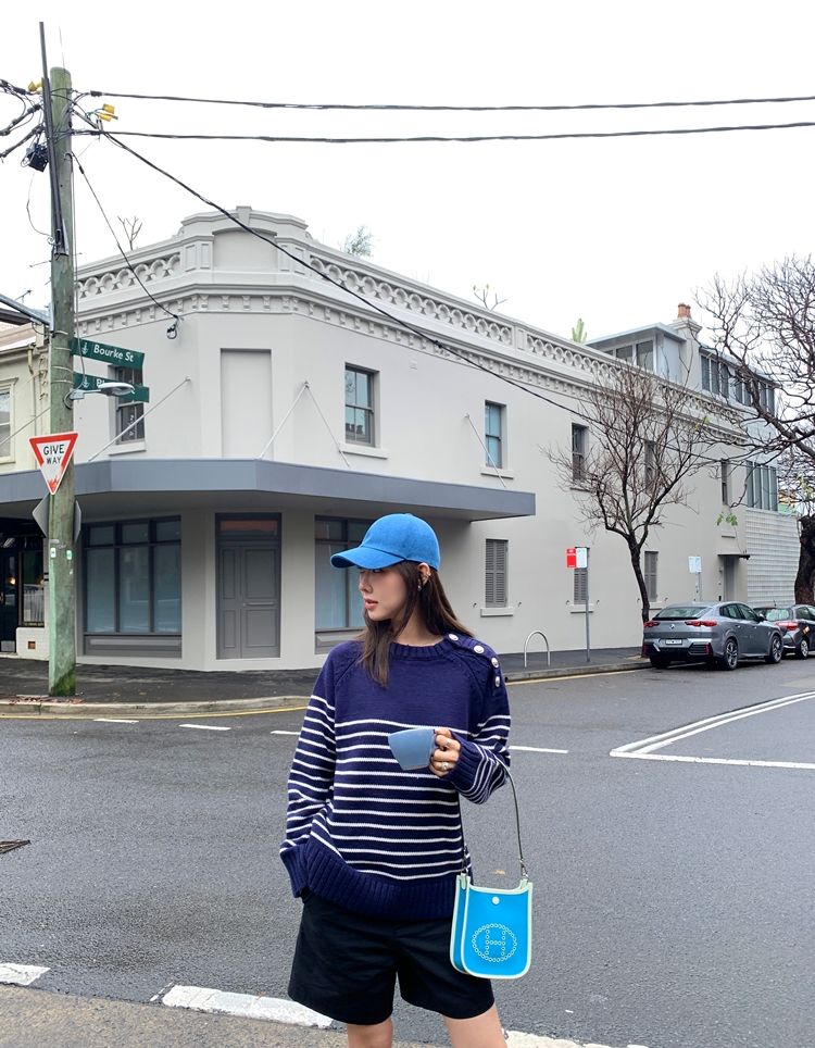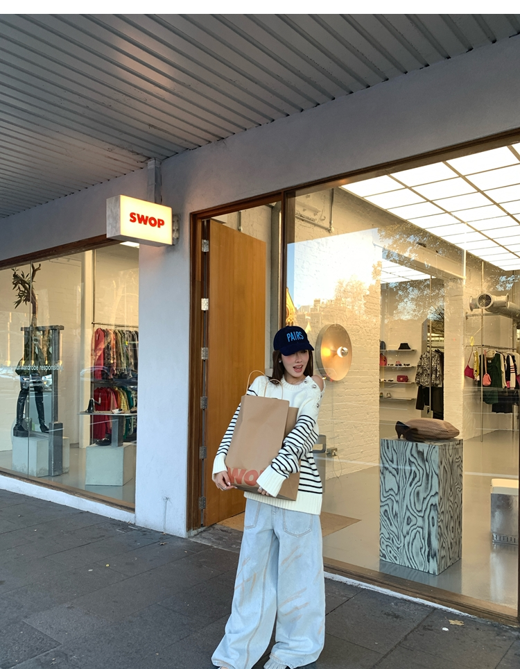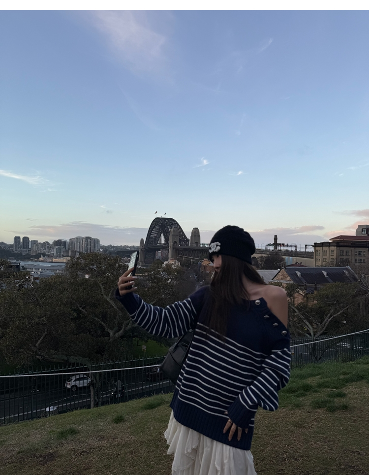 Autumn Winter Contrast Striped Shoulder Button Thick Sweater