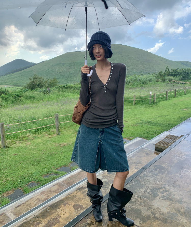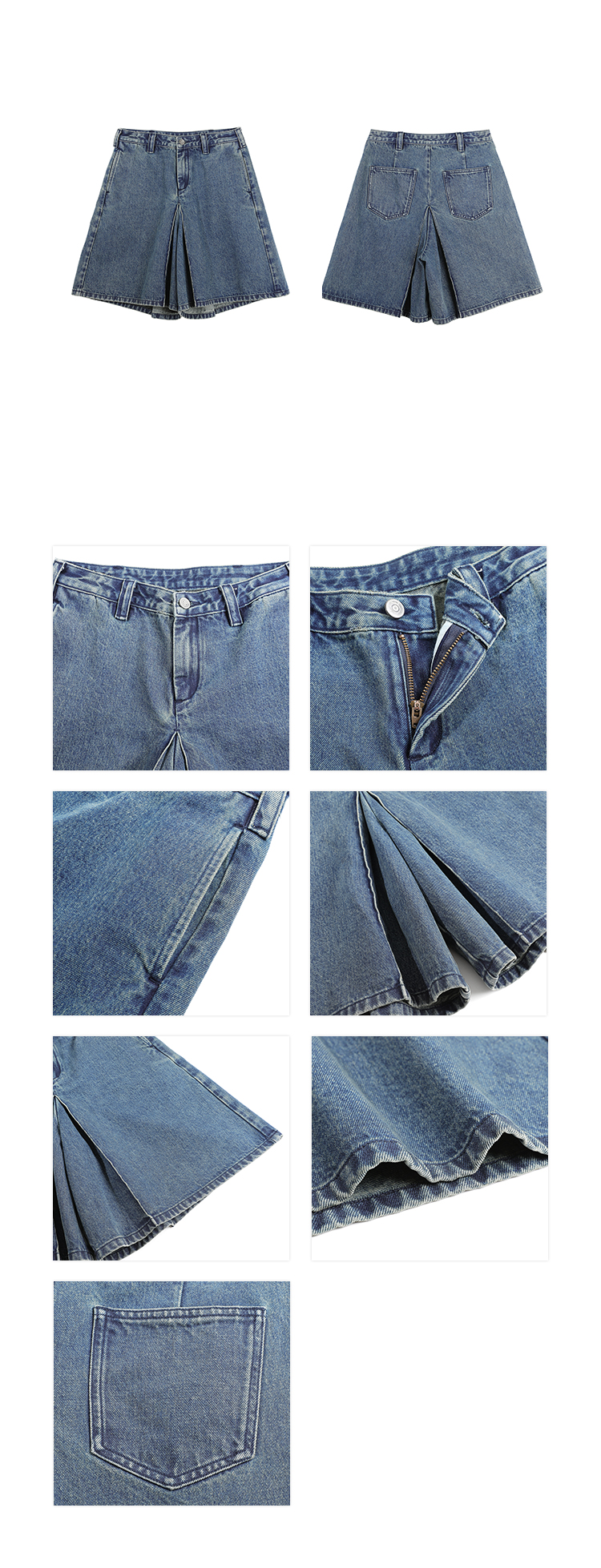 cotton vintage washed blue A-line I-shaped pleated denim pants