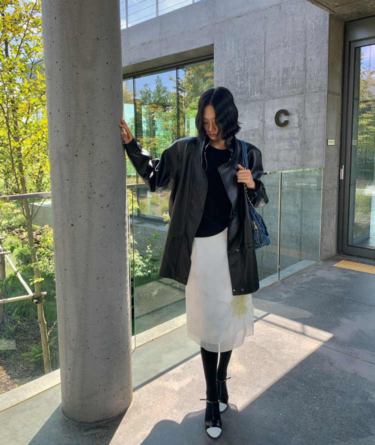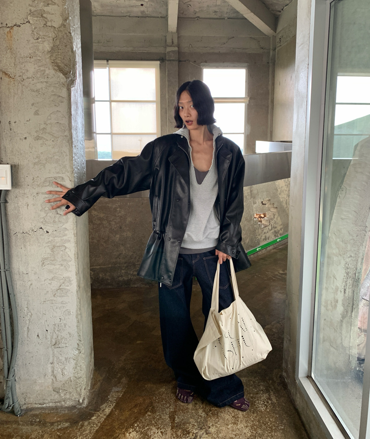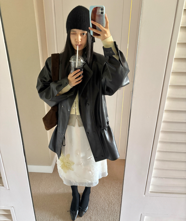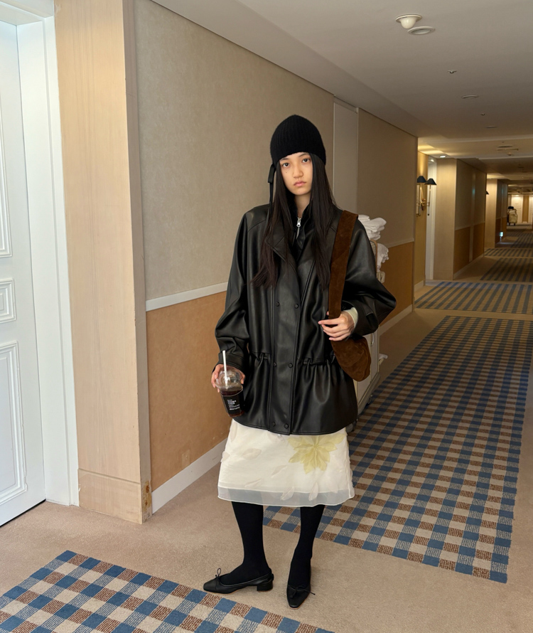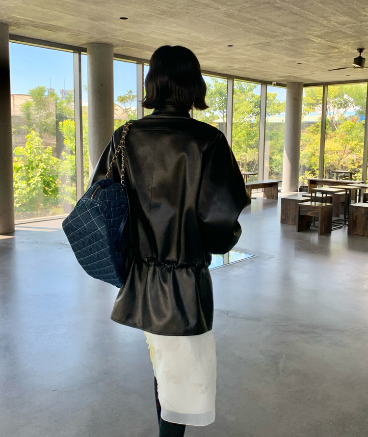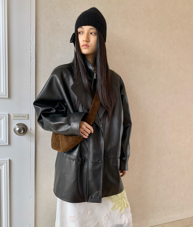 double-breasted drawstring mid-length eco-friendly leather jacket