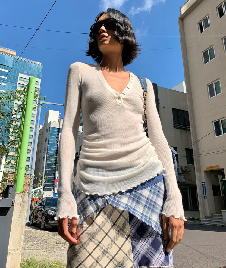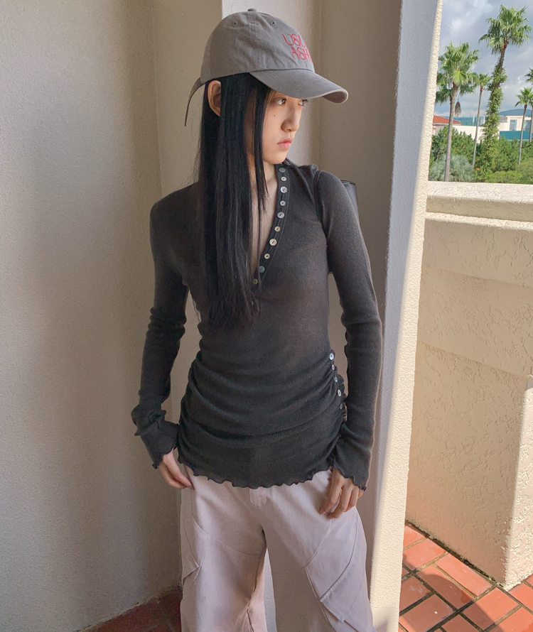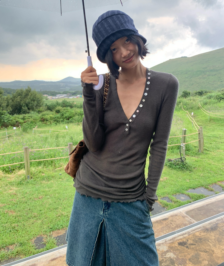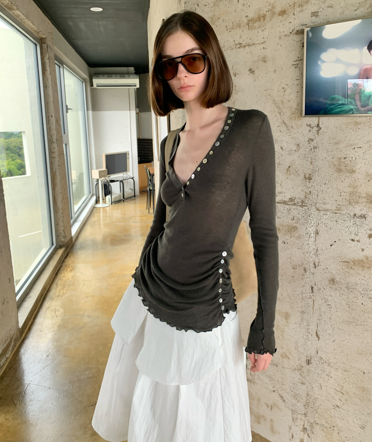 deep V-neck asymmetrical buttoned wave-trimmed knit top