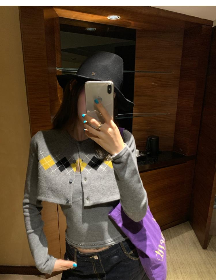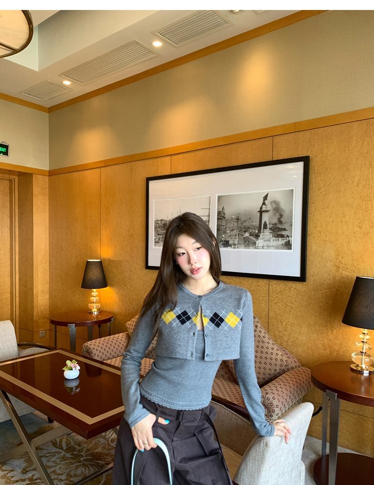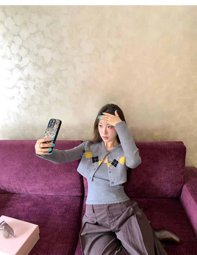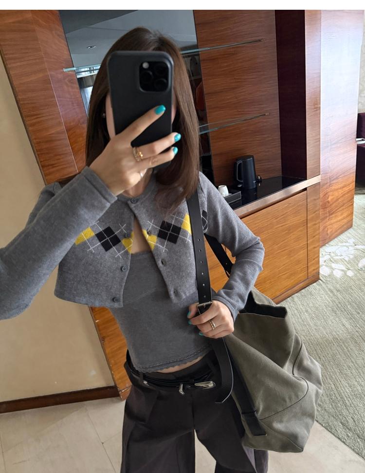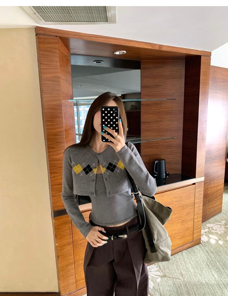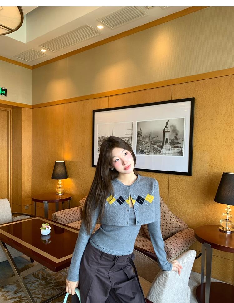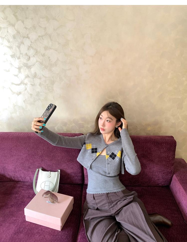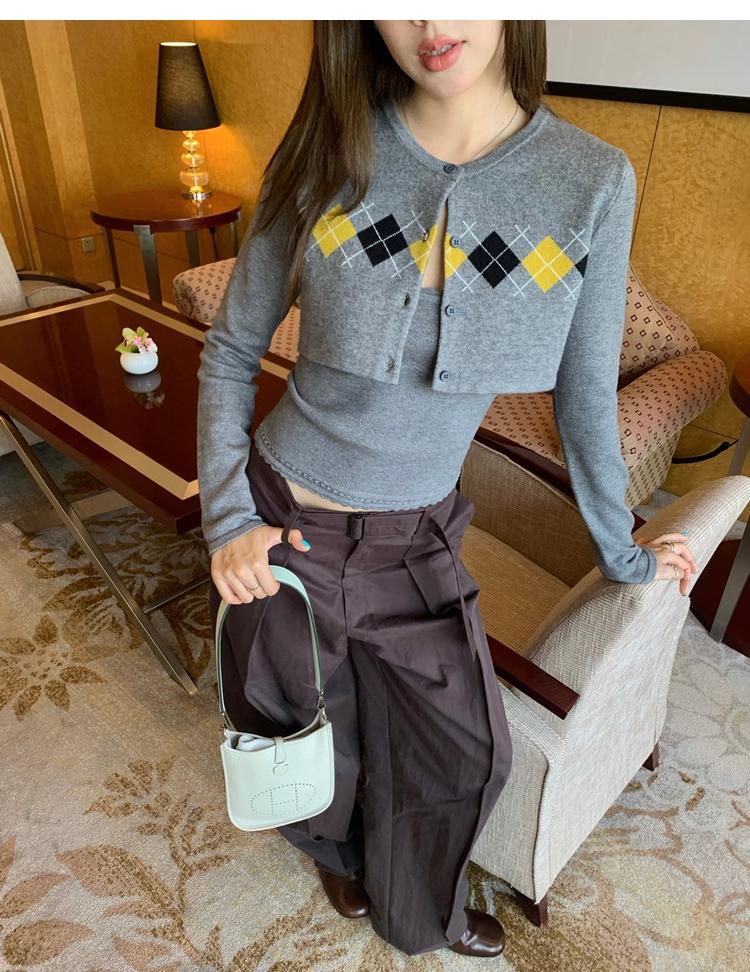 old money diamond pattern knitted cardigan suspenders two-piece set