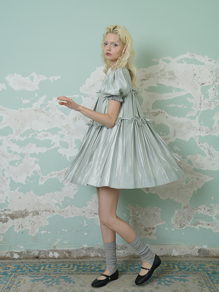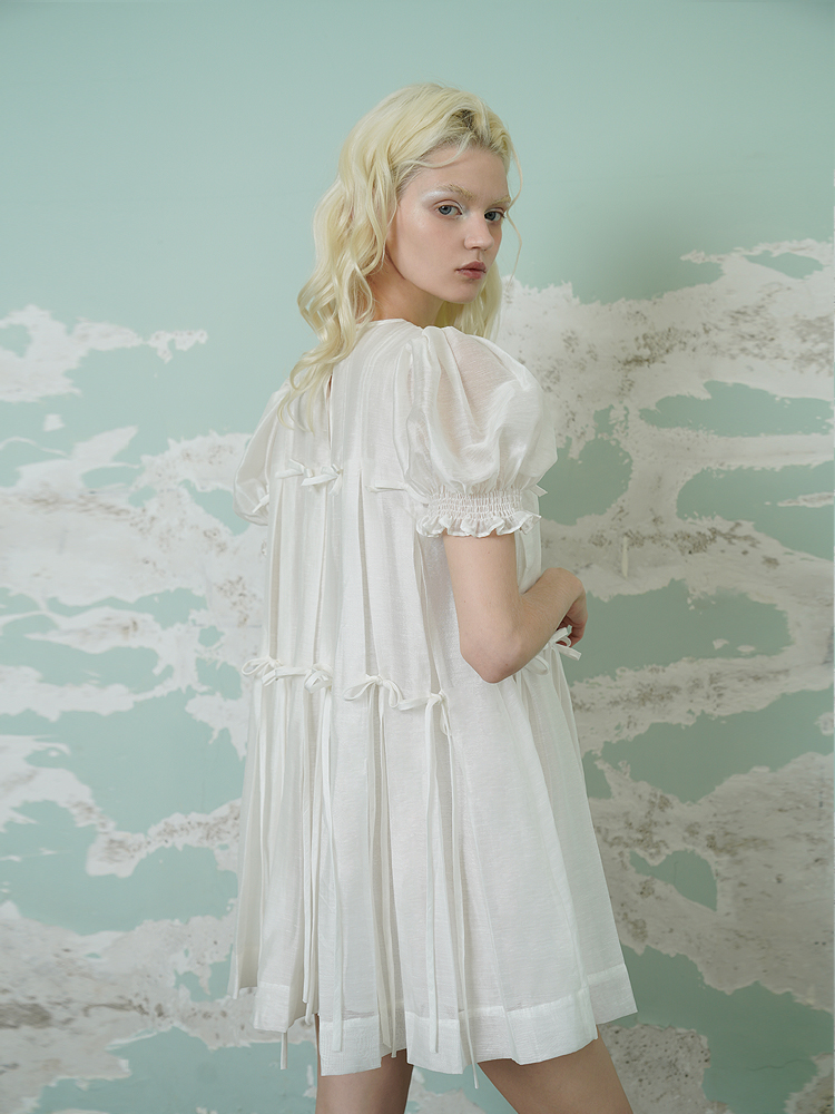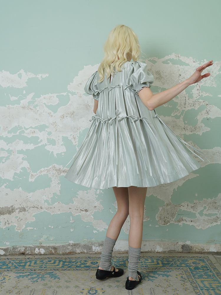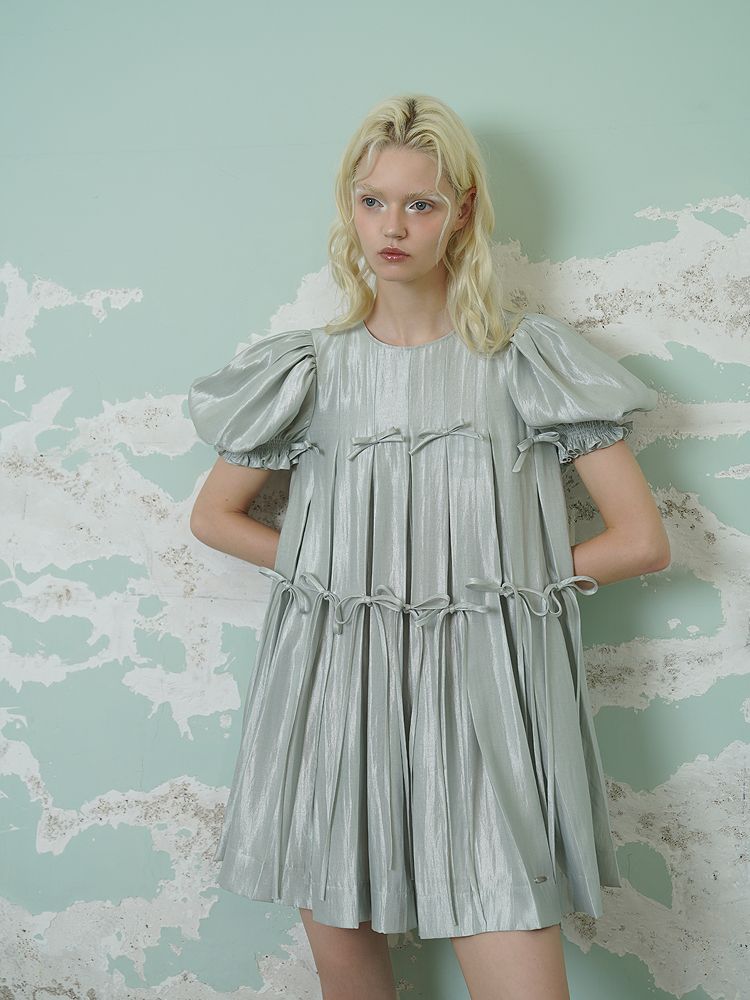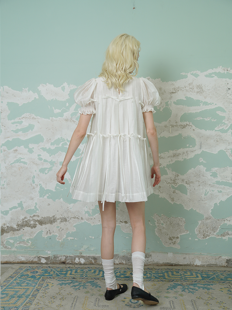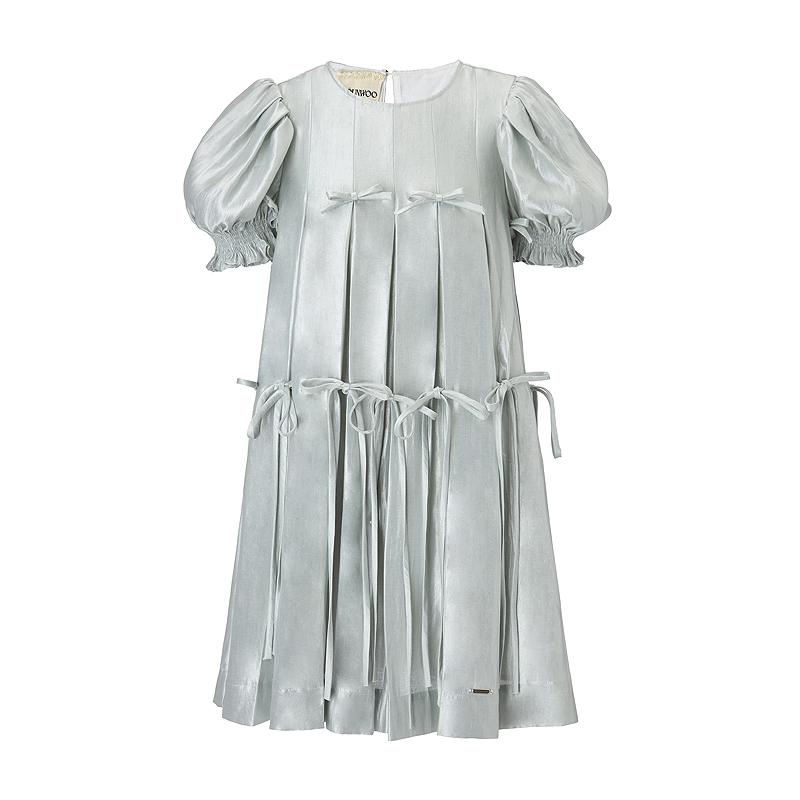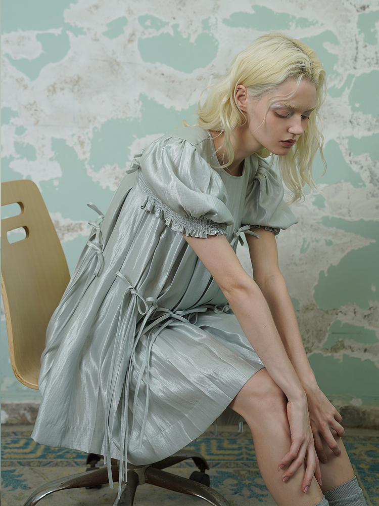 Silk and linen high-end puff sleeve doll fairy A-line dress