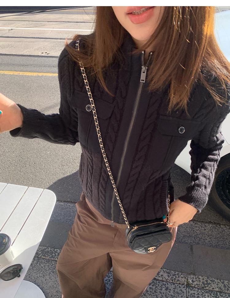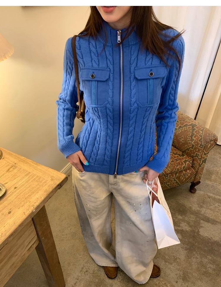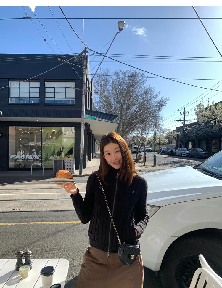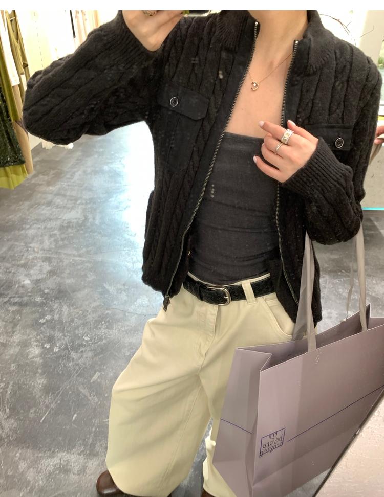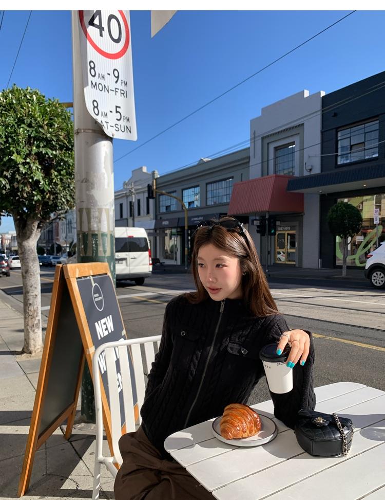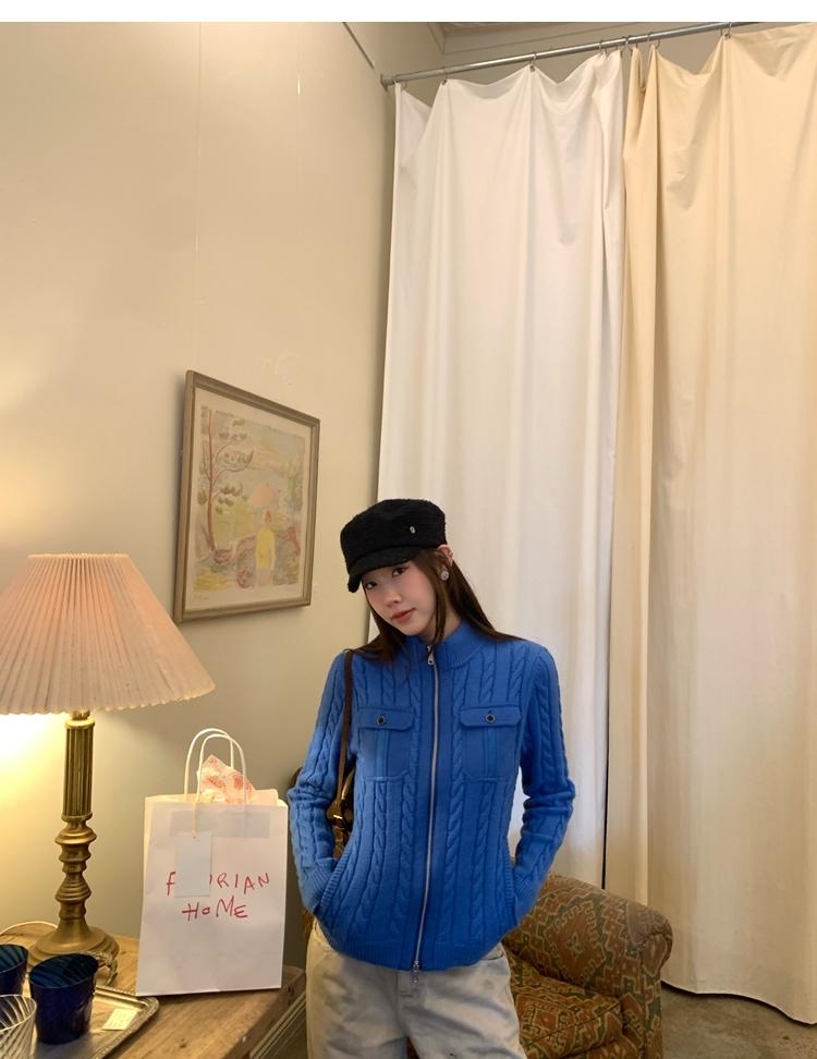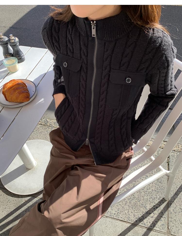 minimalist Row casual stand-up collar double pocket zipper cable knit cardigan