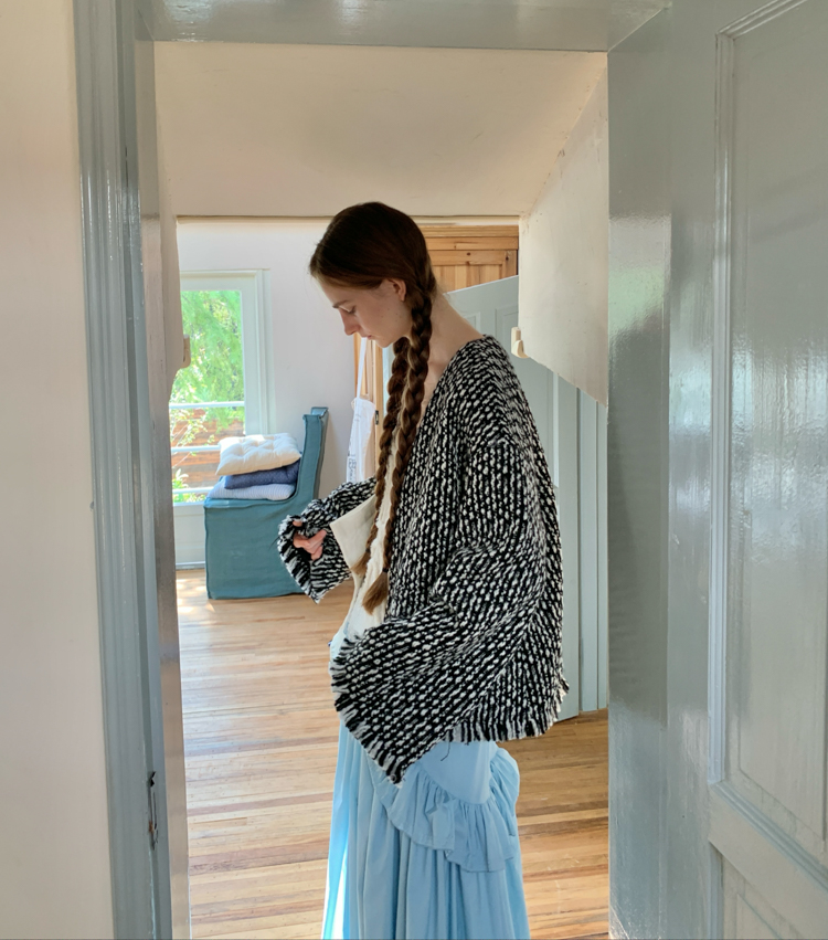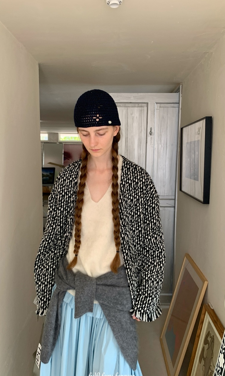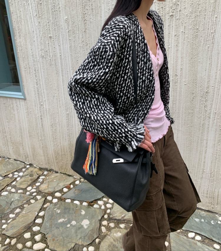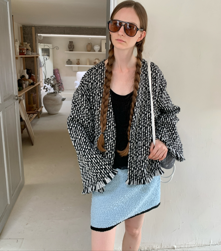 Wool Black and White Mixed Color V-neck Shoulder Short Jacket