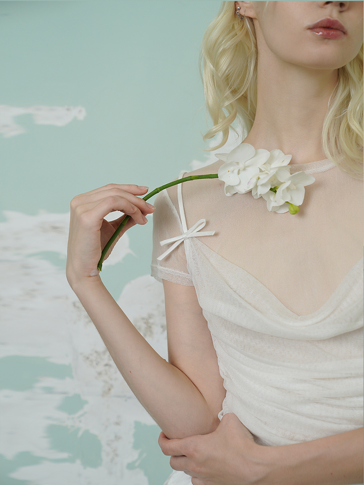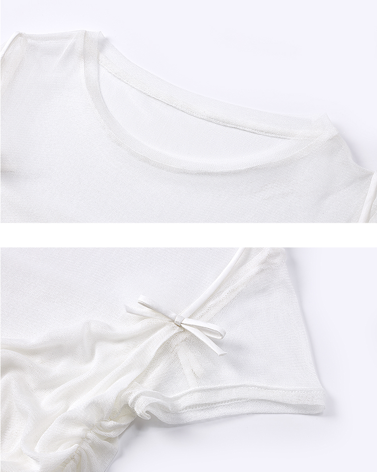 Pleated silk elastic mesh ballet style slim collar T-shirt