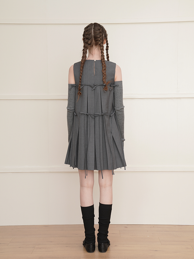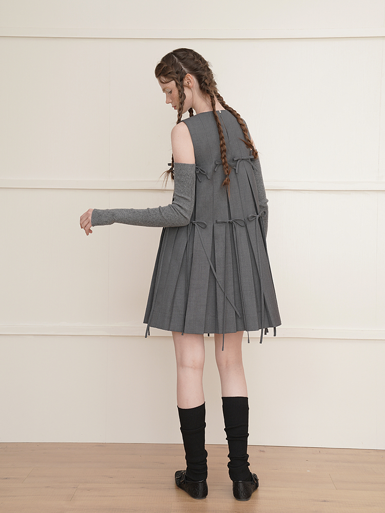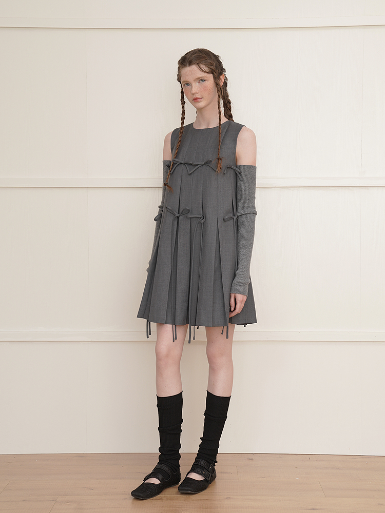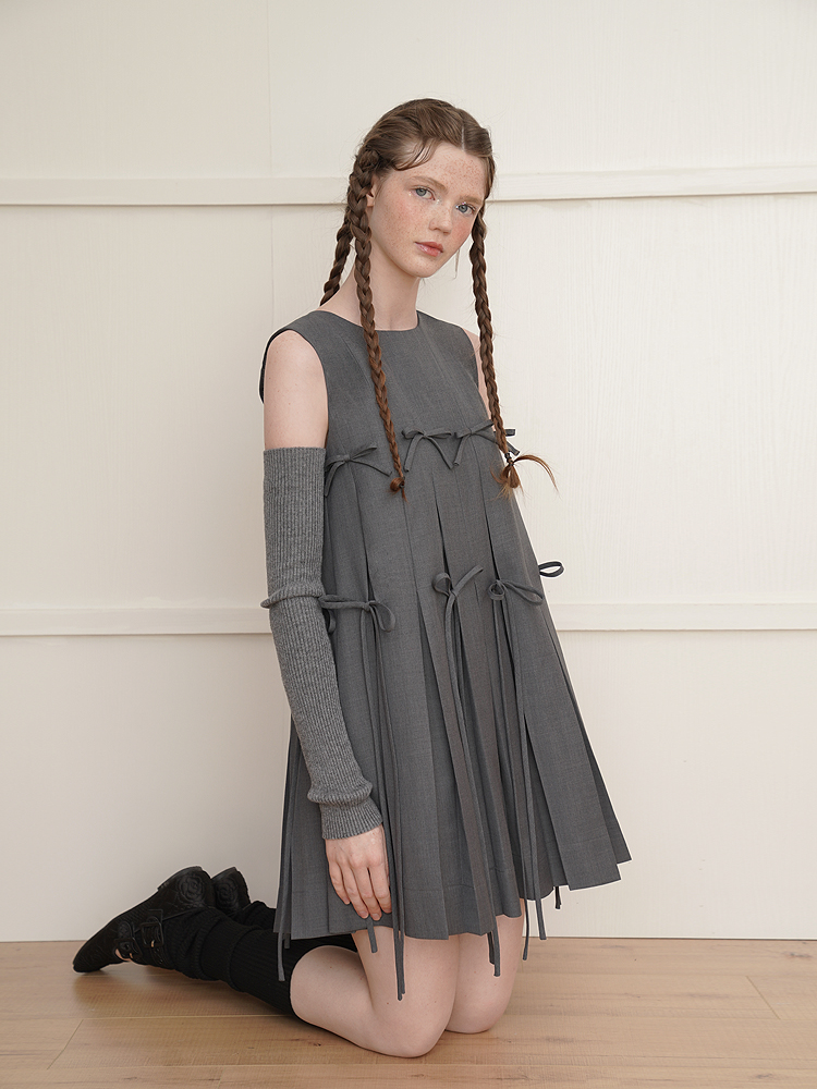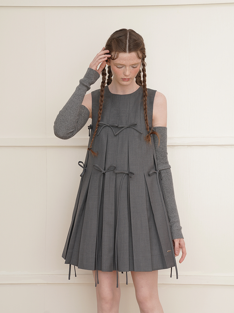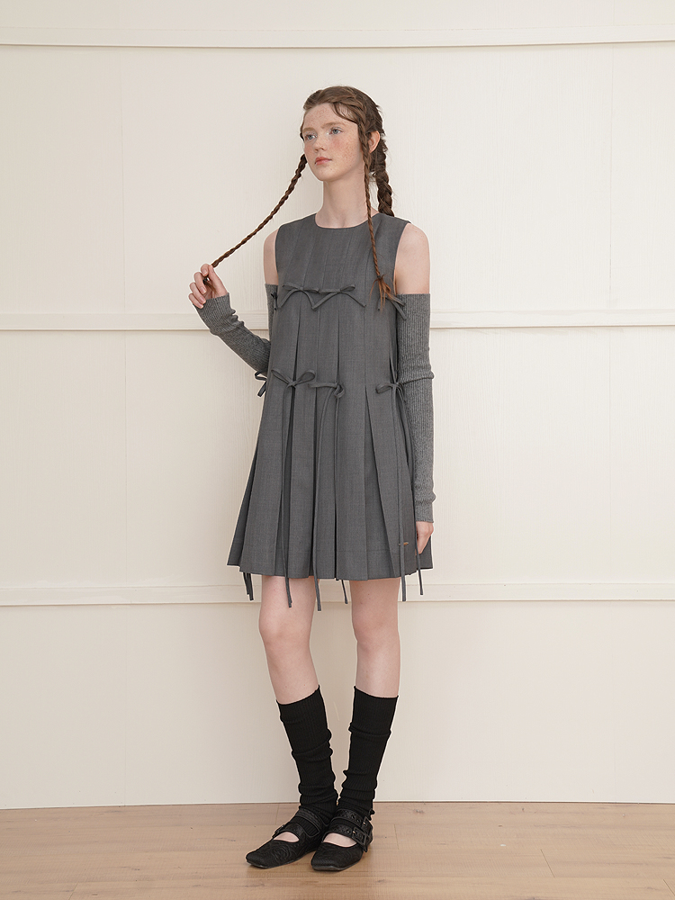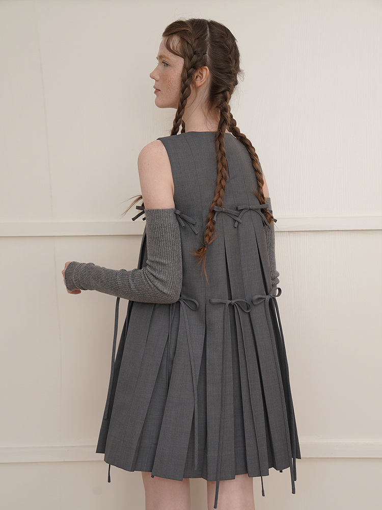 Wool lace-up bow pleated high-end slim sleeveless dress