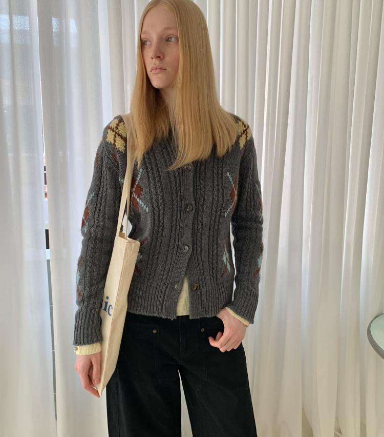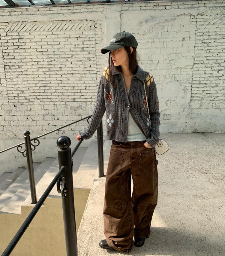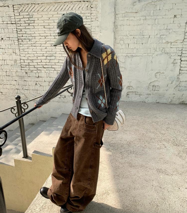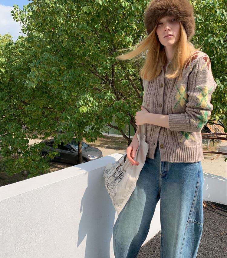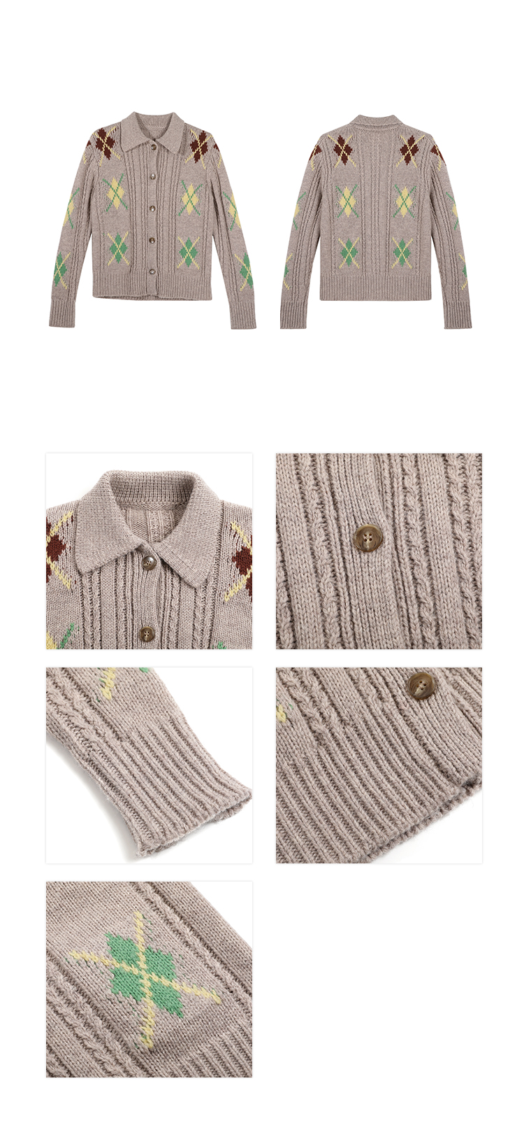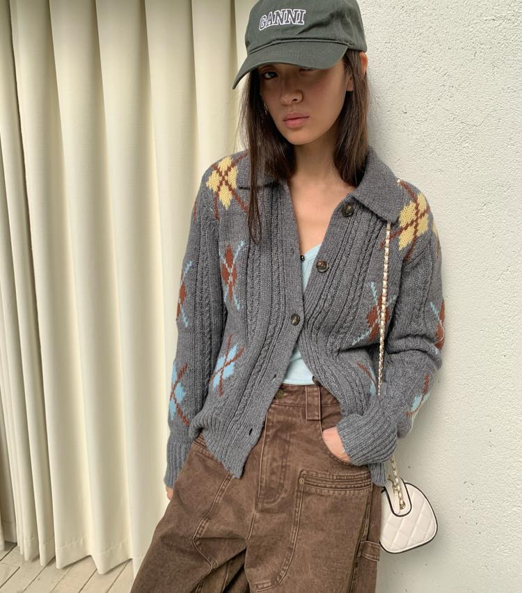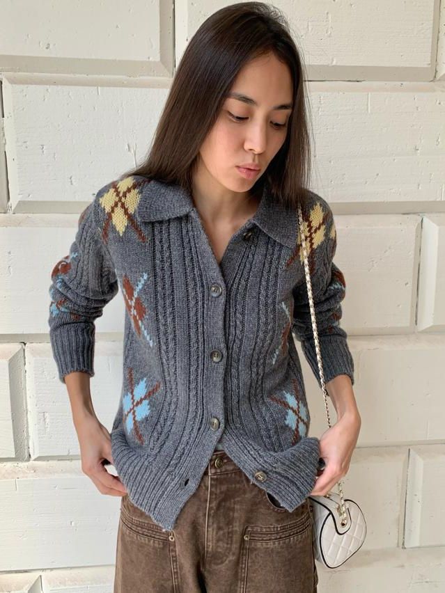 Wool Vintage Lattice Twisted Flower Academy Collar Sweater Cardigan