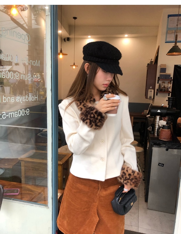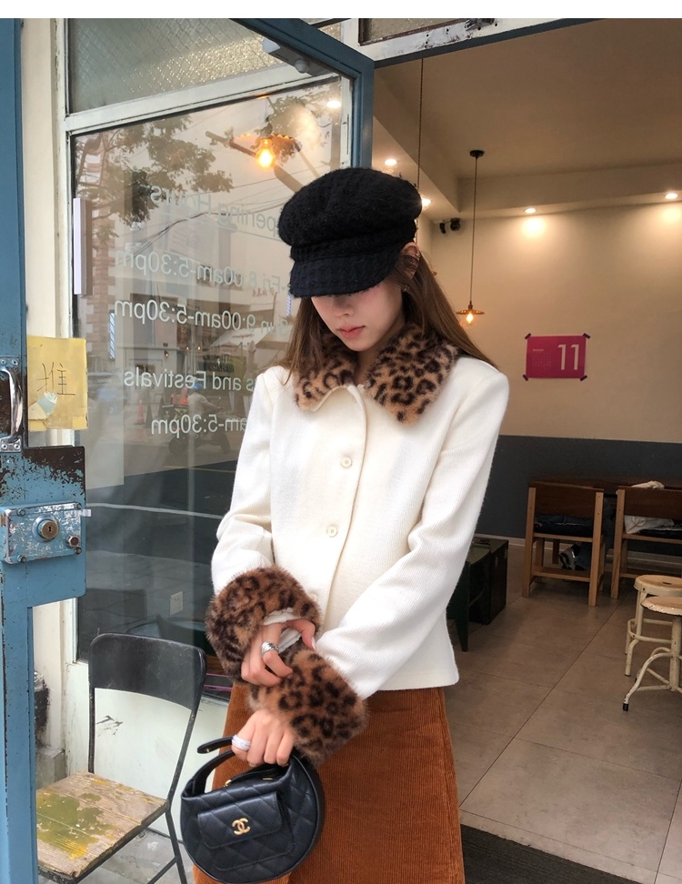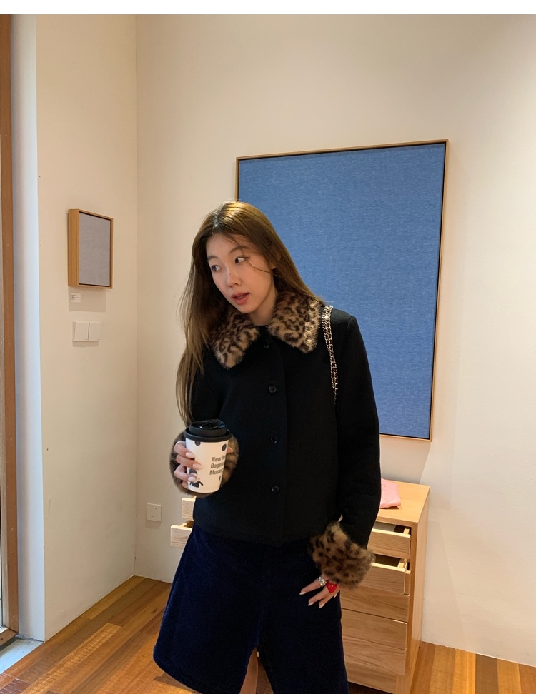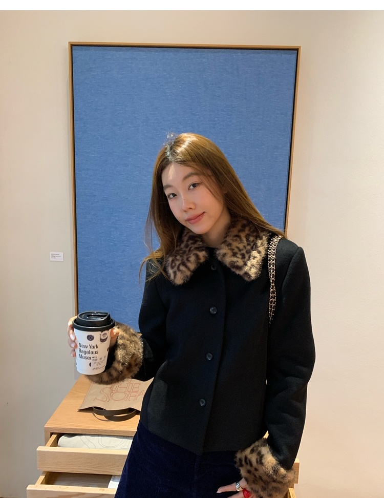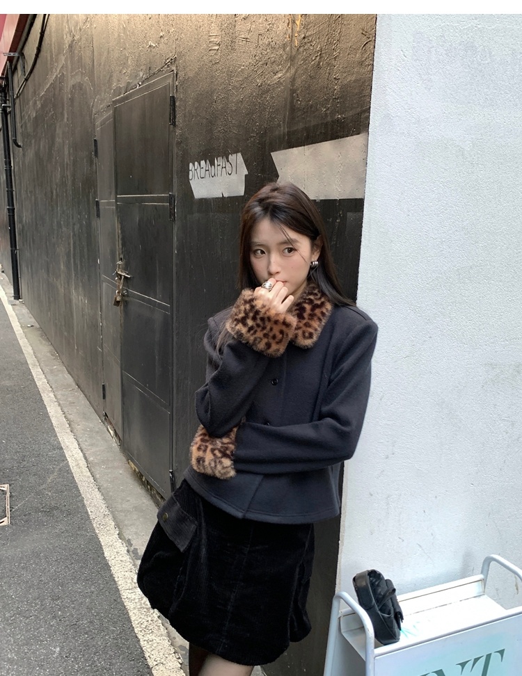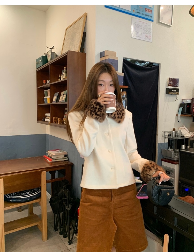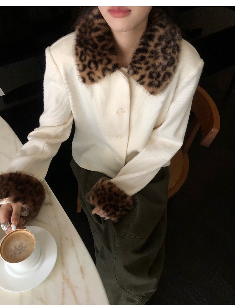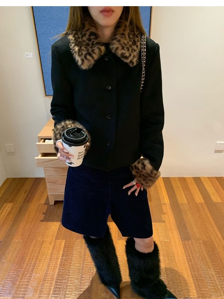 Antique leopard print fur collar single-breasted short jacket