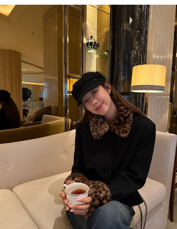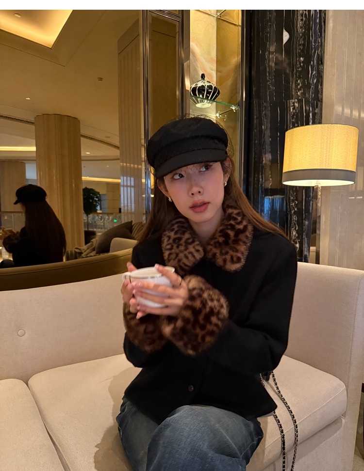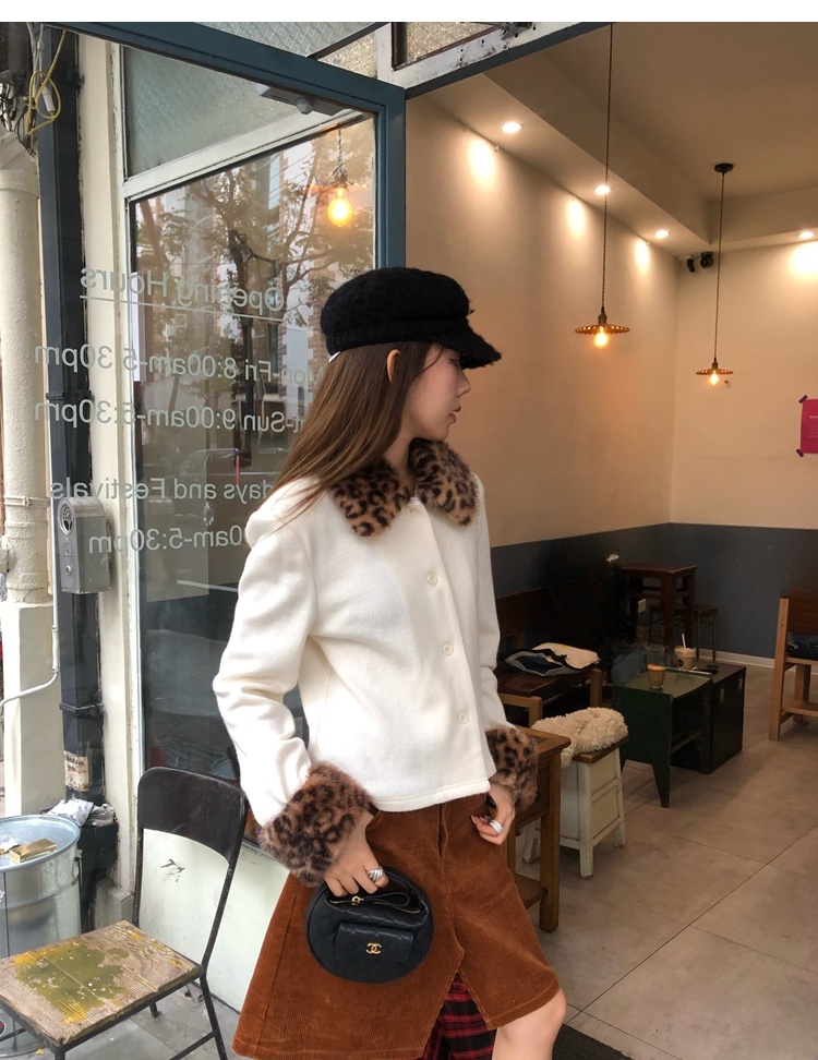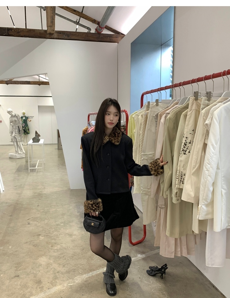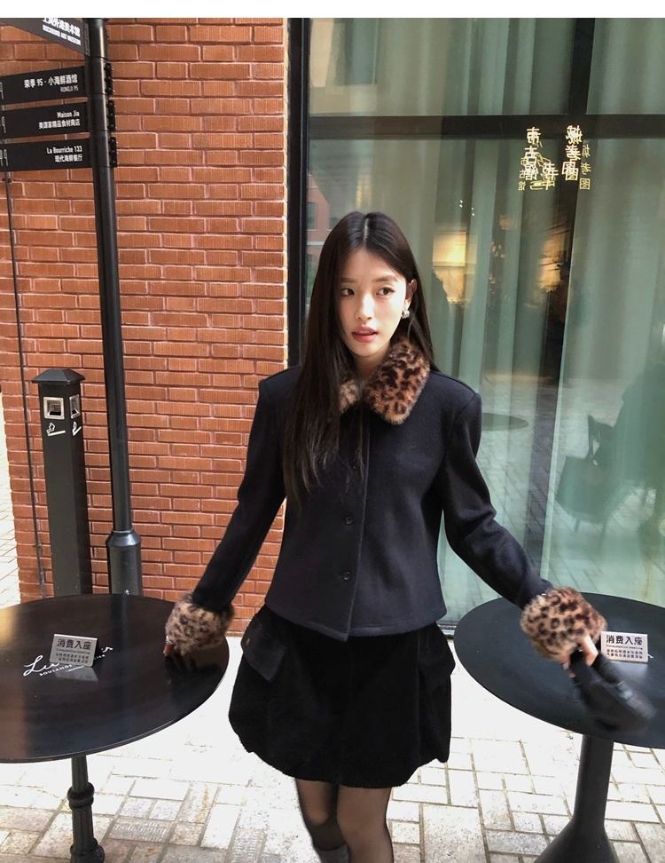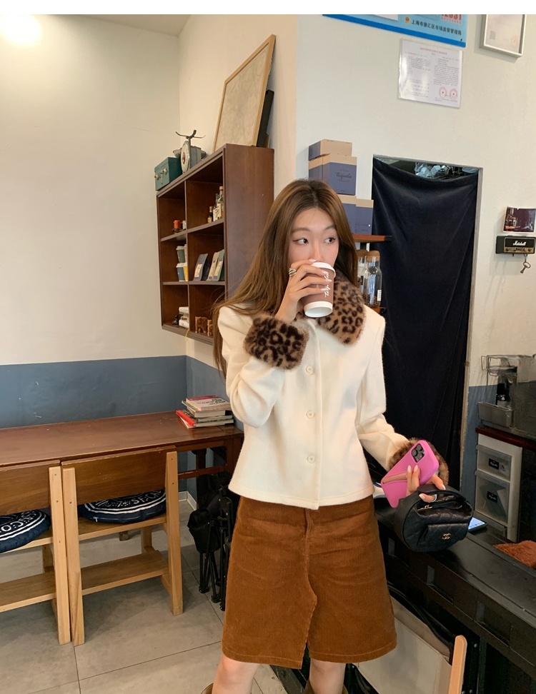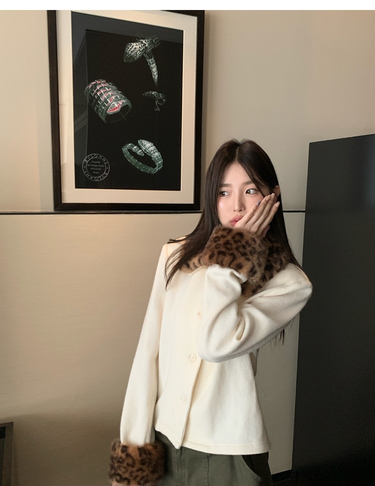 Antique leopard print fur collar single-breasted short jacket
