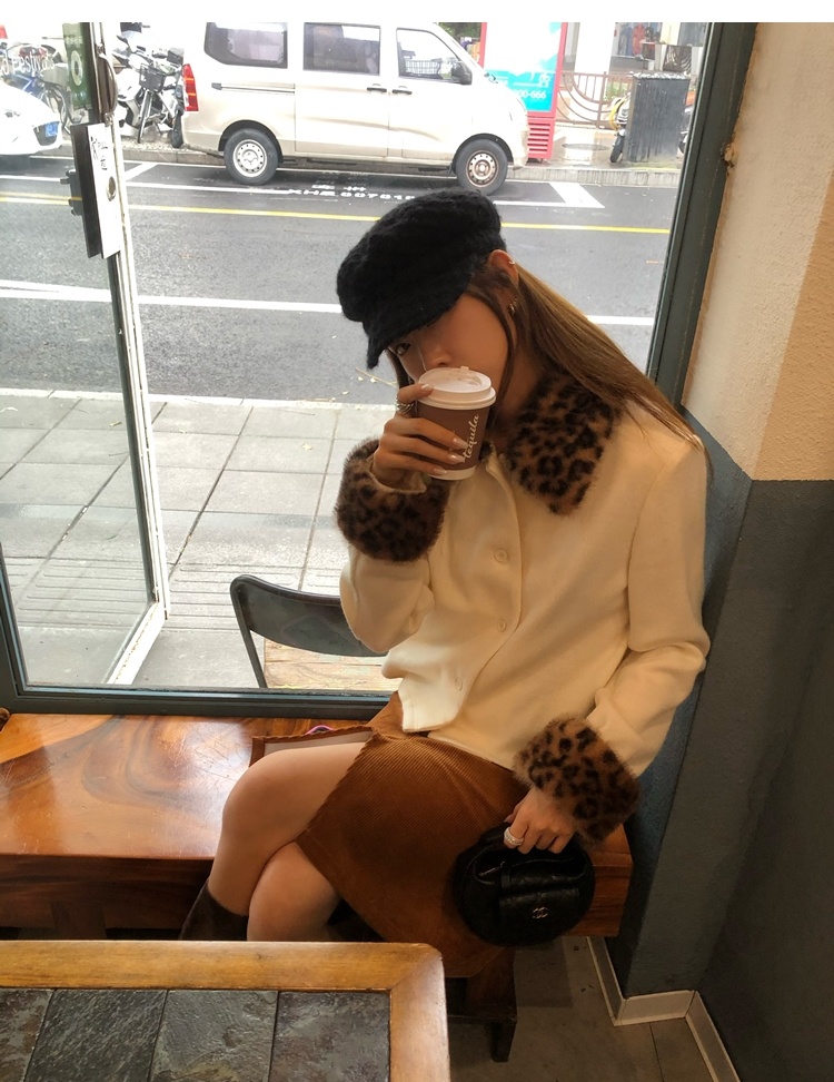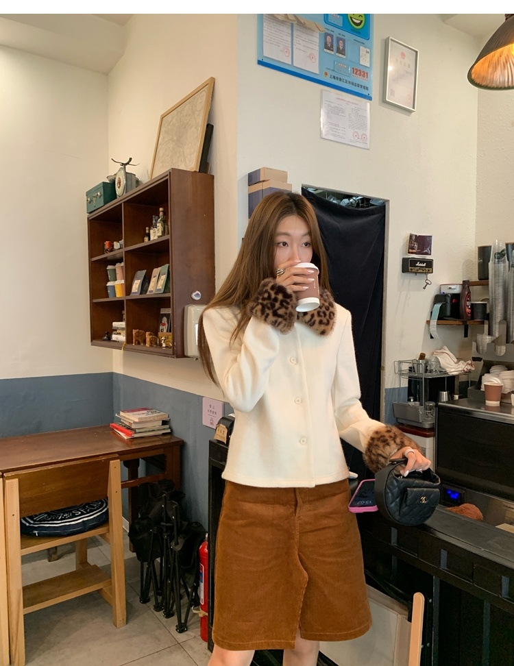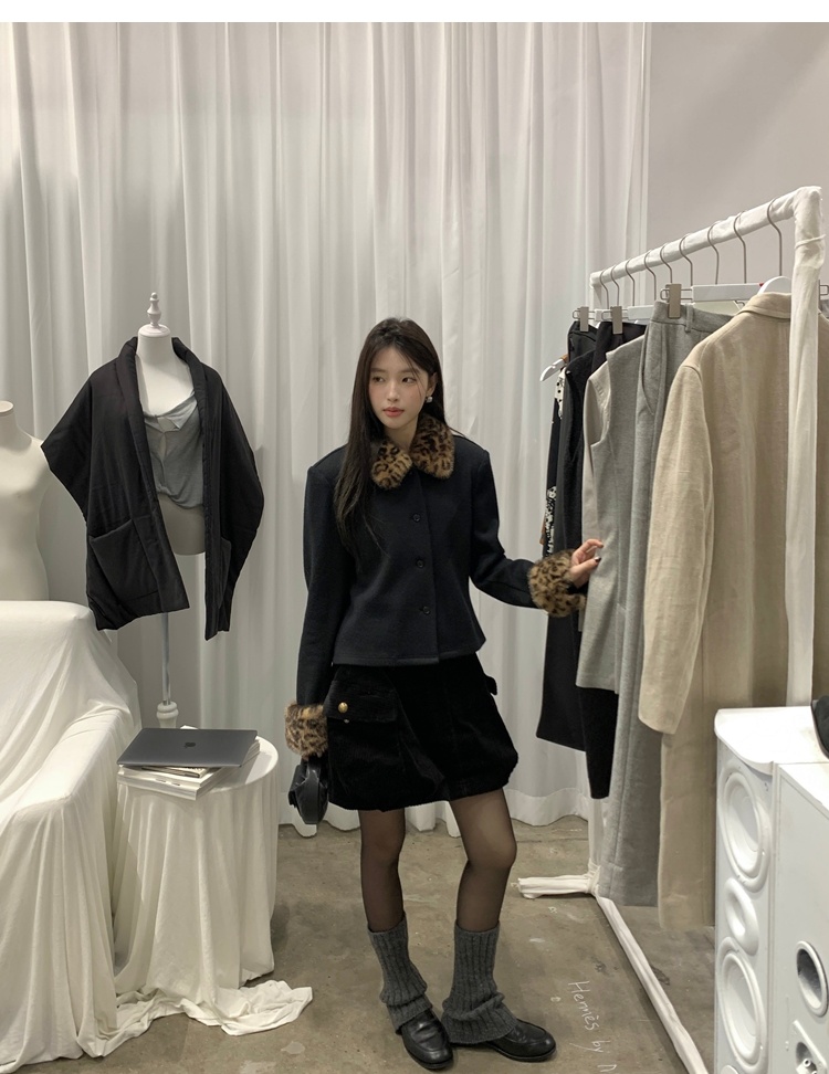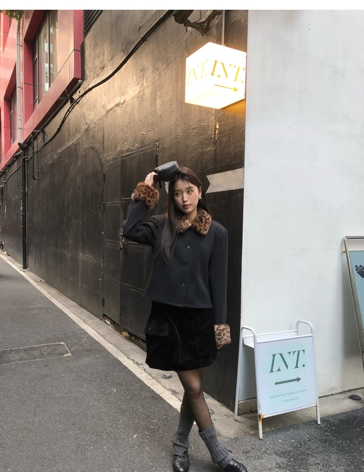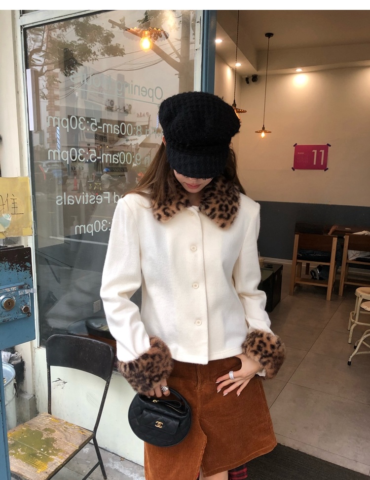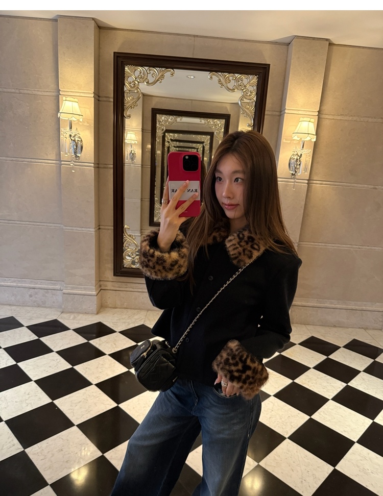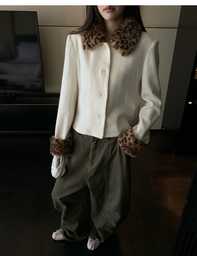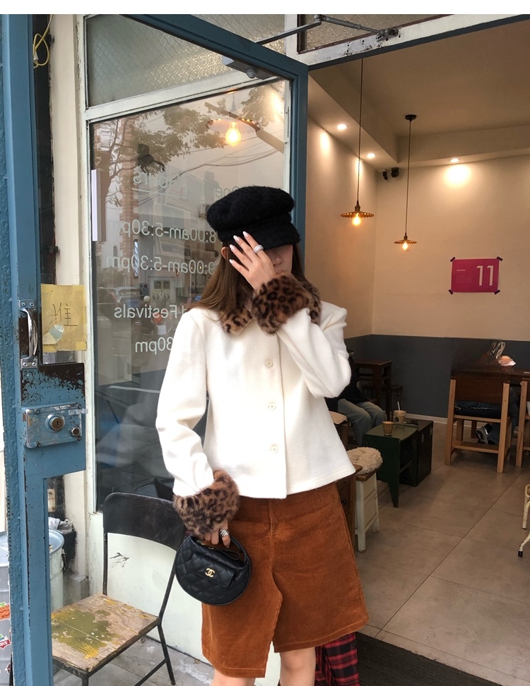Antique leopard print fur collar single-breasted short jacket