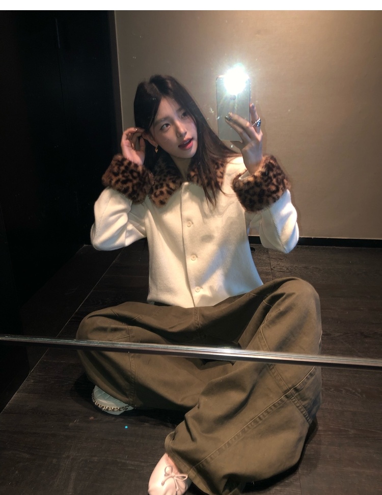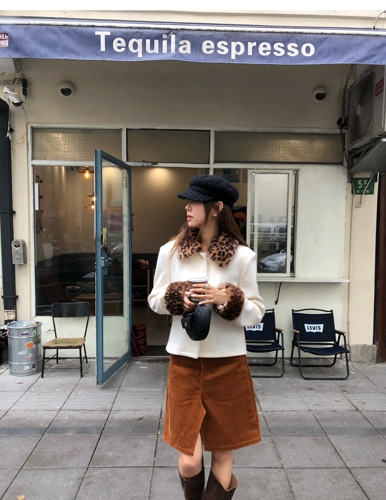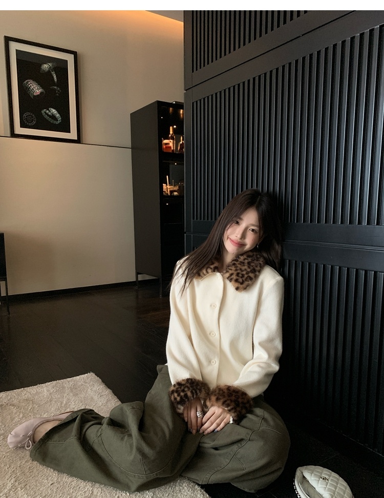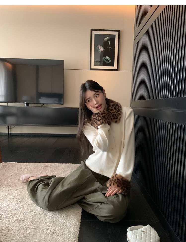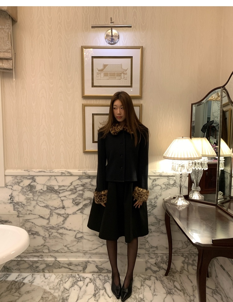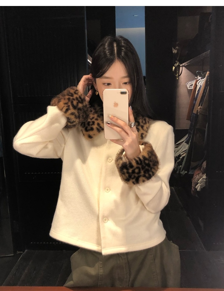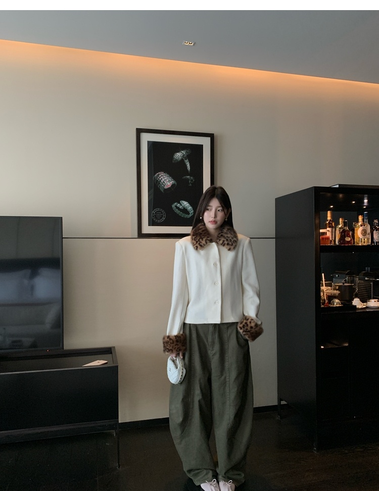 Antique leopard print fur collar single-breasted short jacket