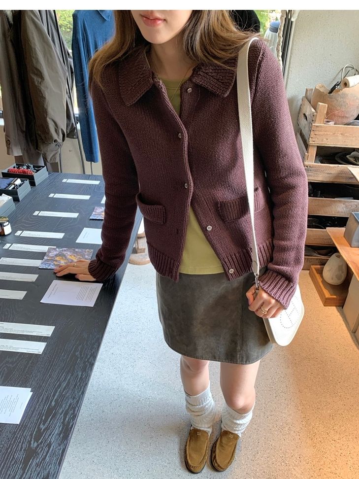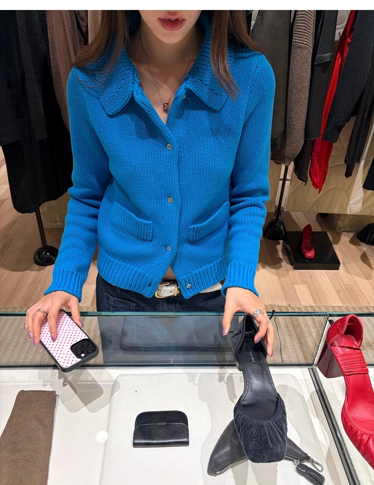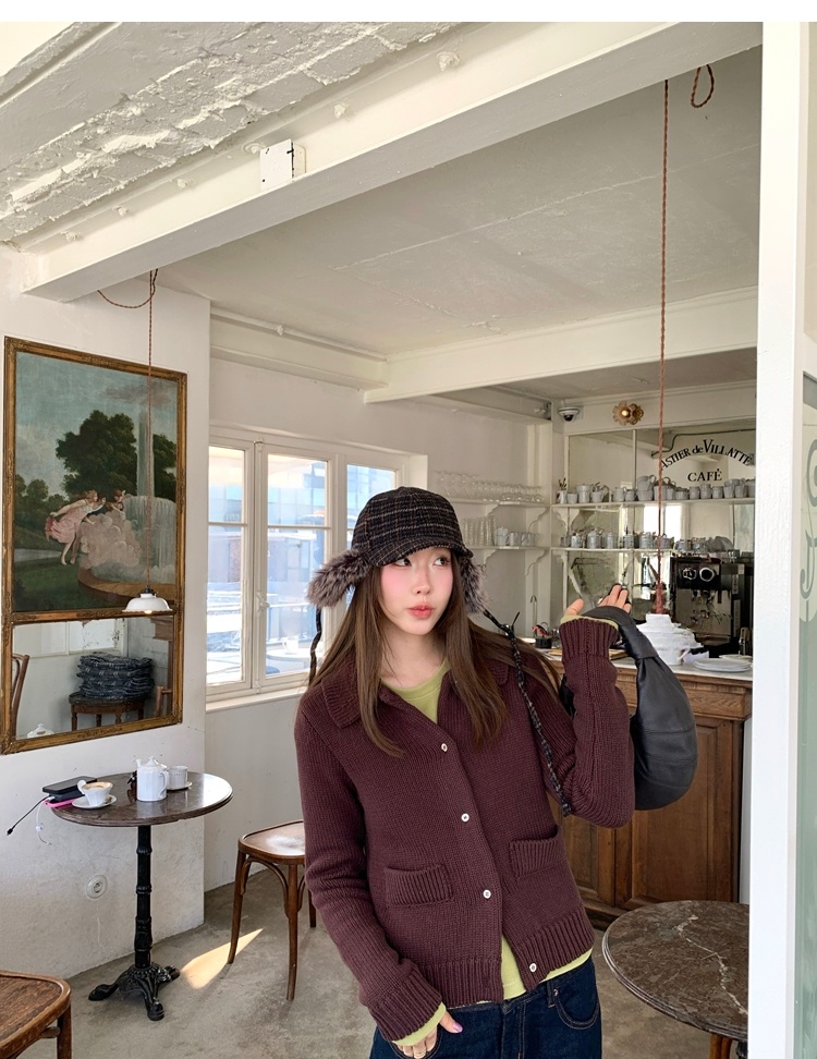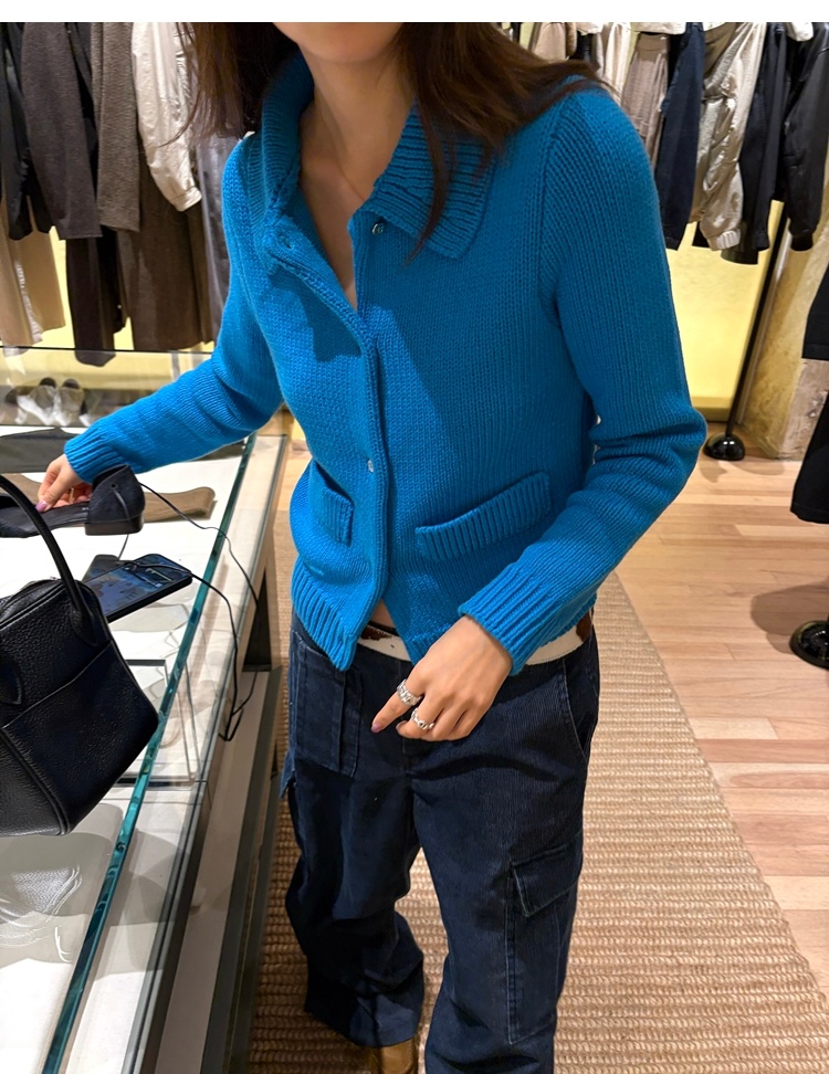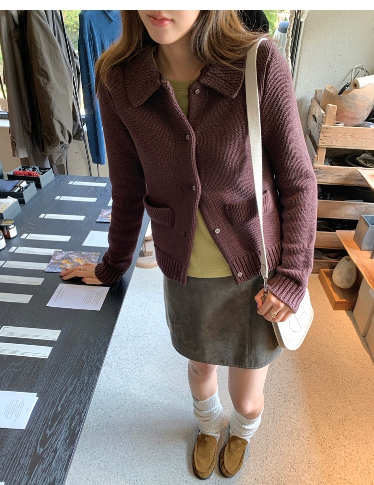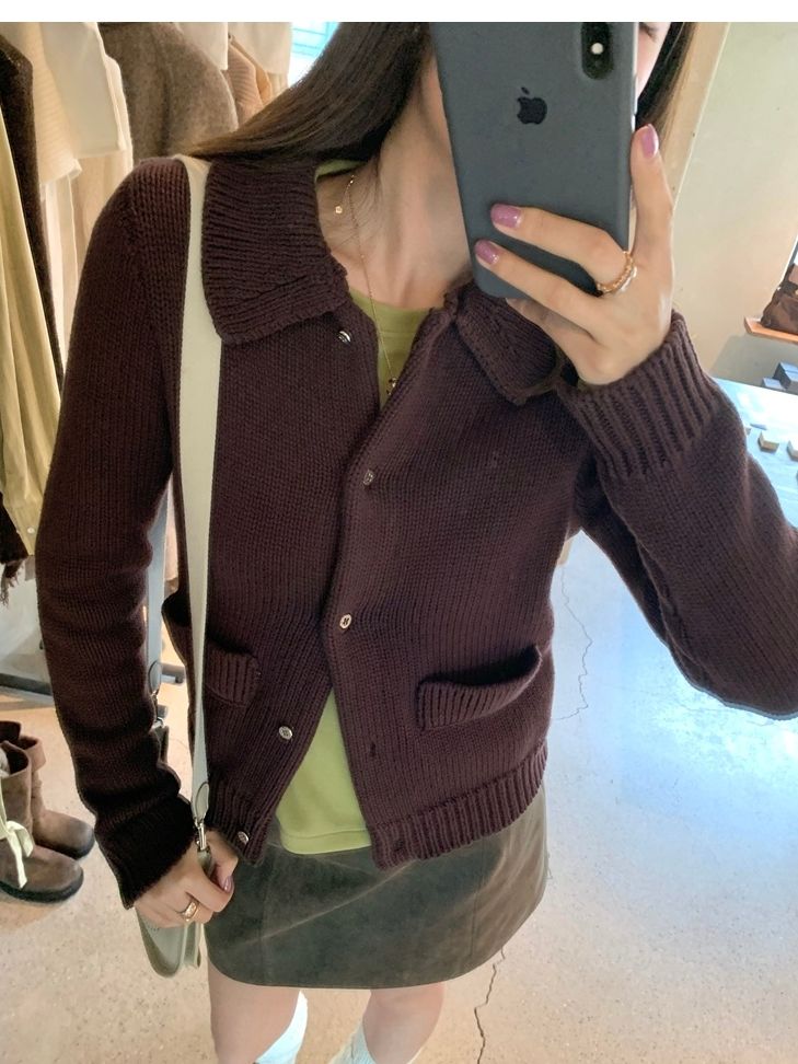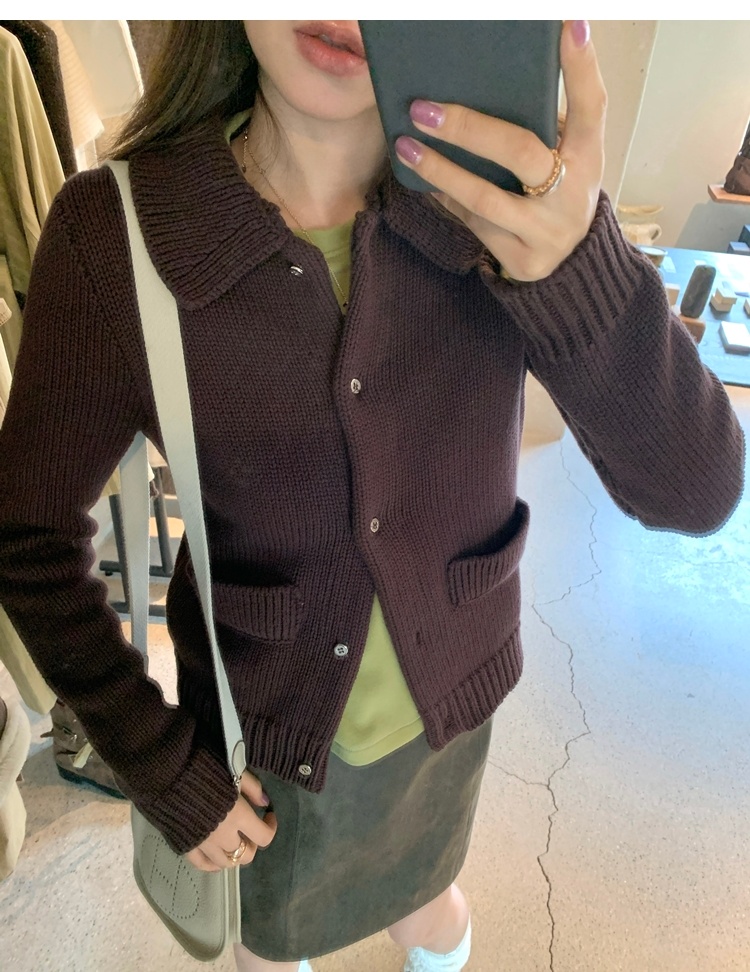 Elegant Mini Collar Double-Pocket Double-Layer Thick Knit Cardigan