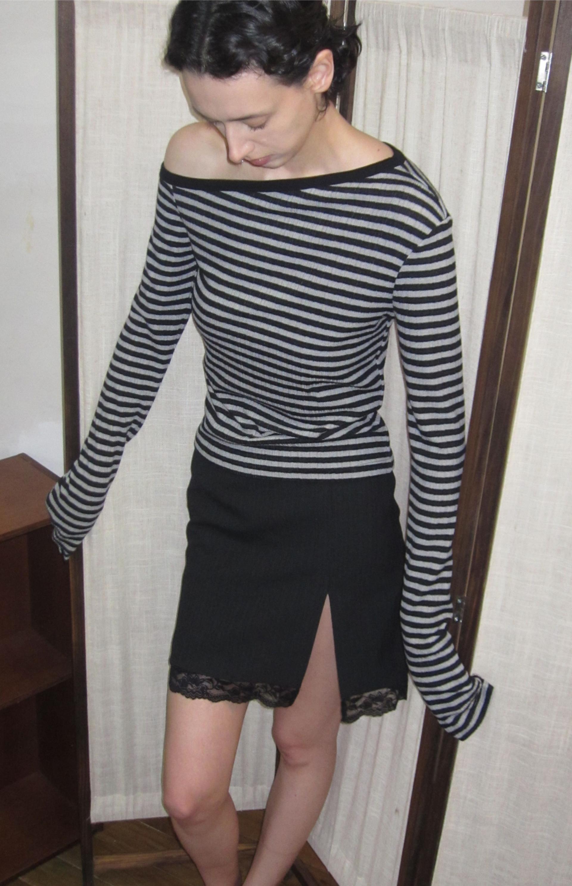 knitted striped off-shoulder loose long-sleeve T-shirt