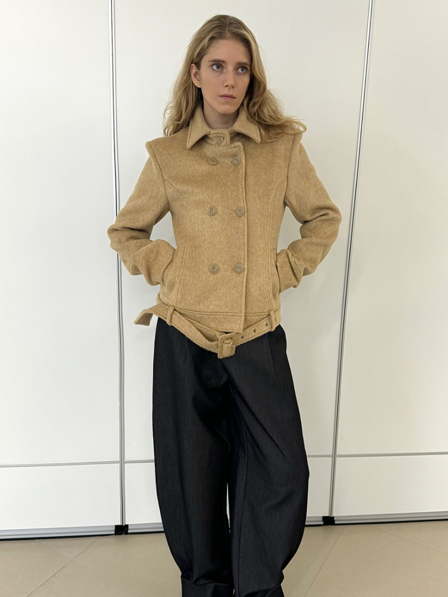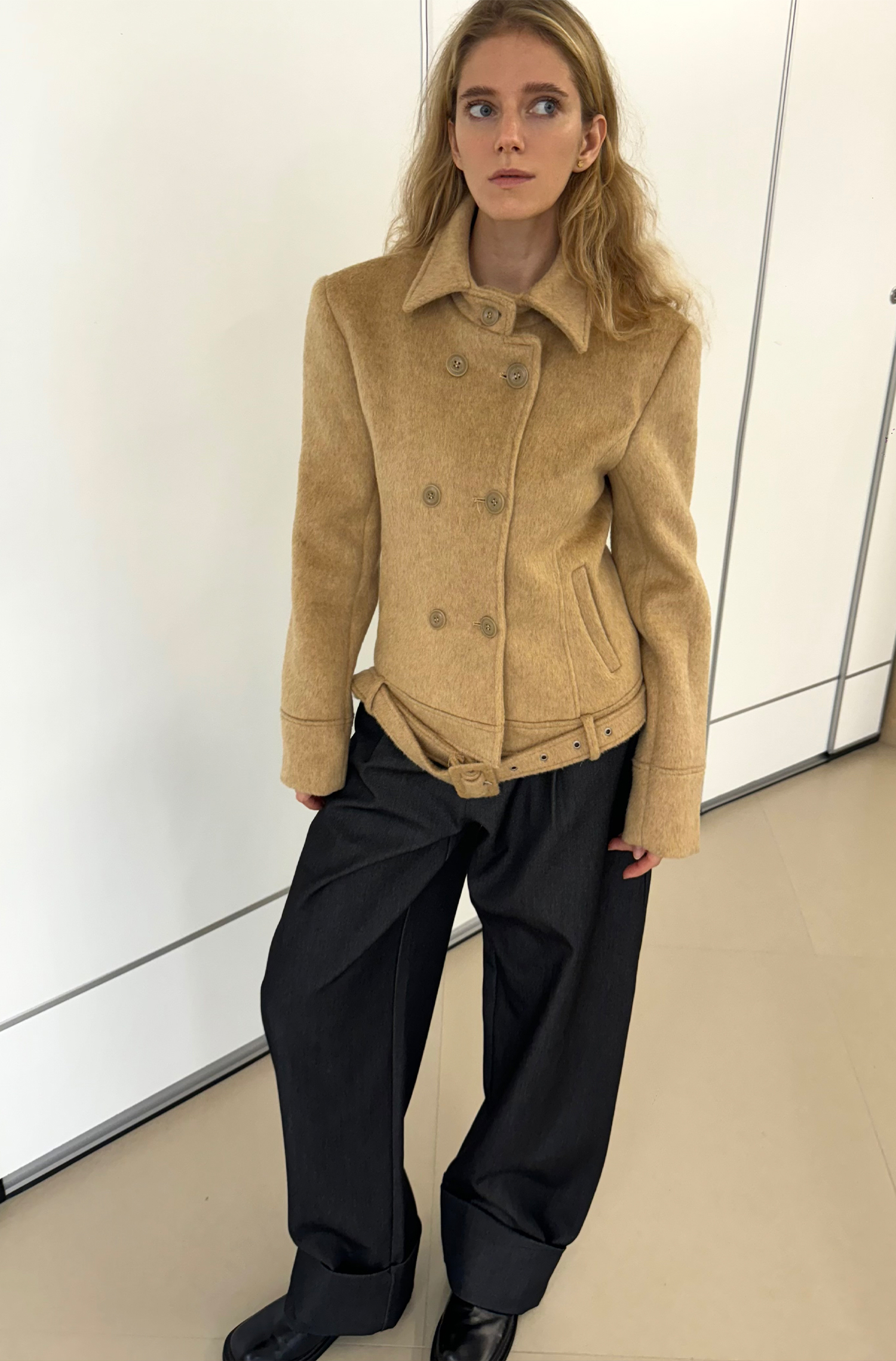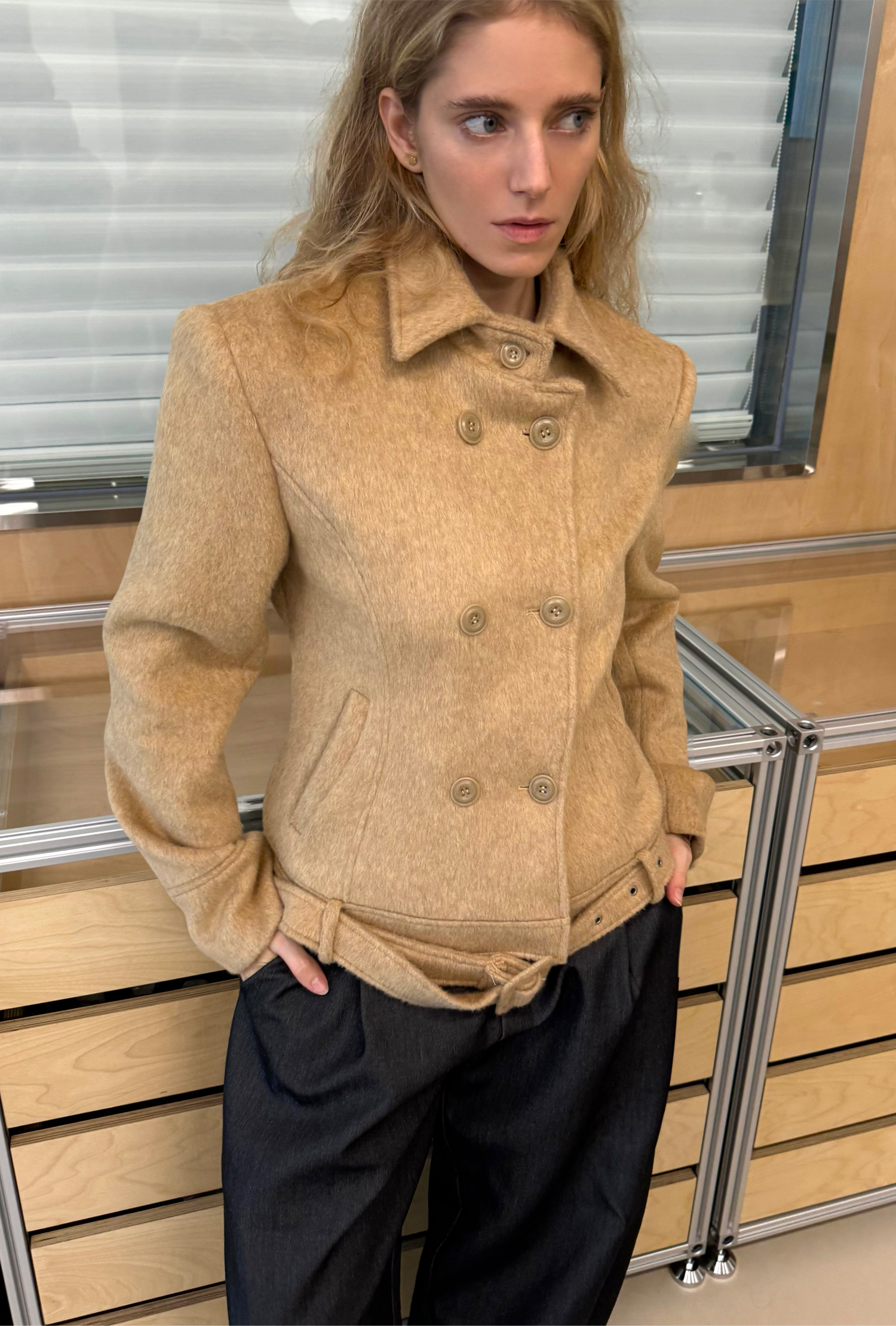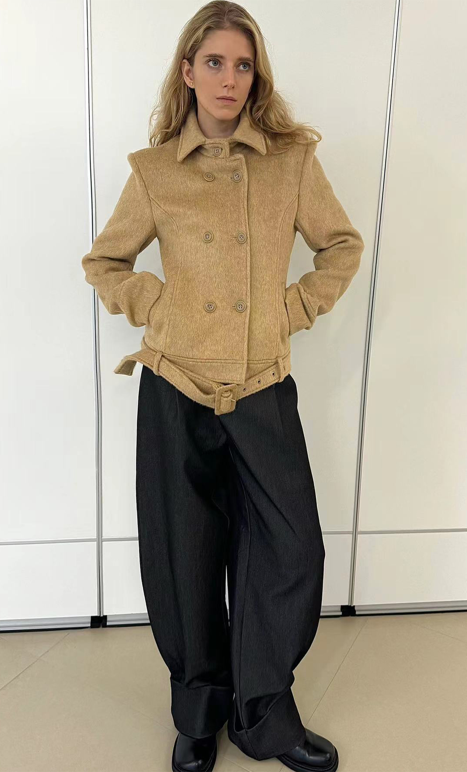 autumn-winter camel-colored fitted wool tweed coat