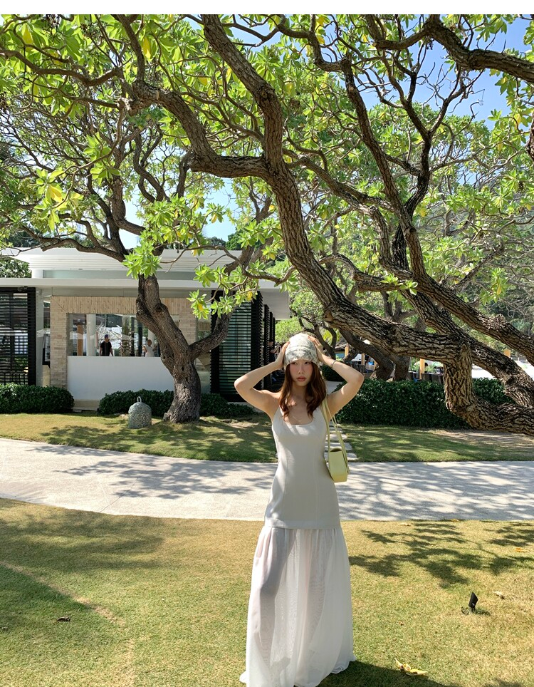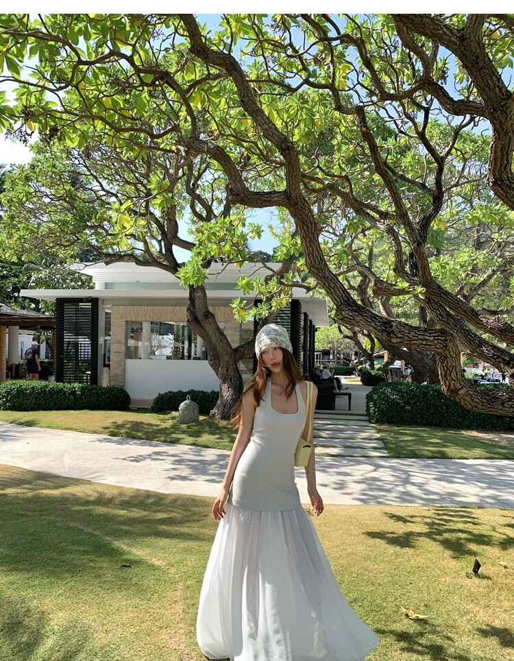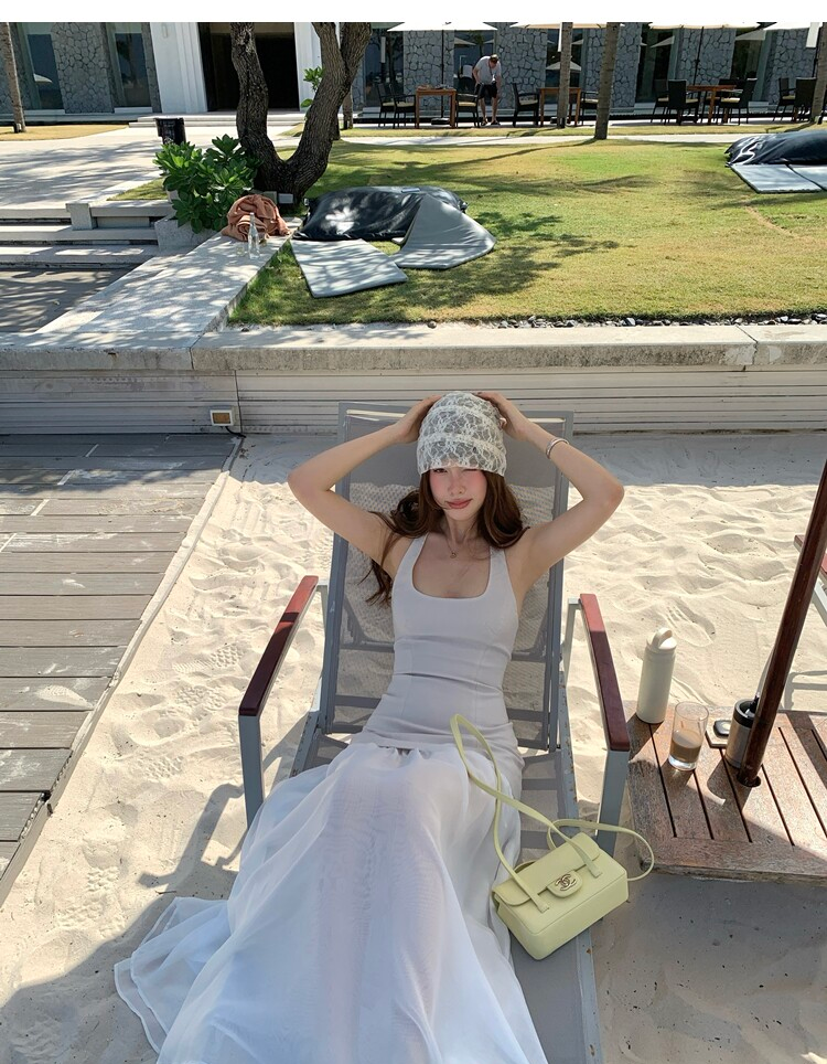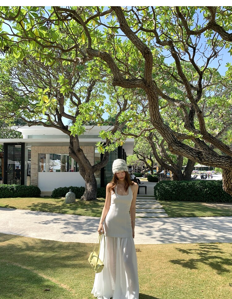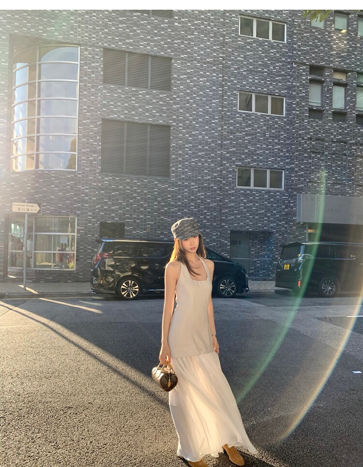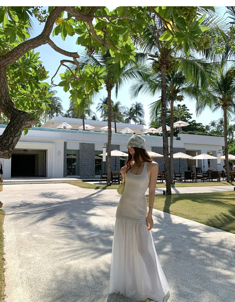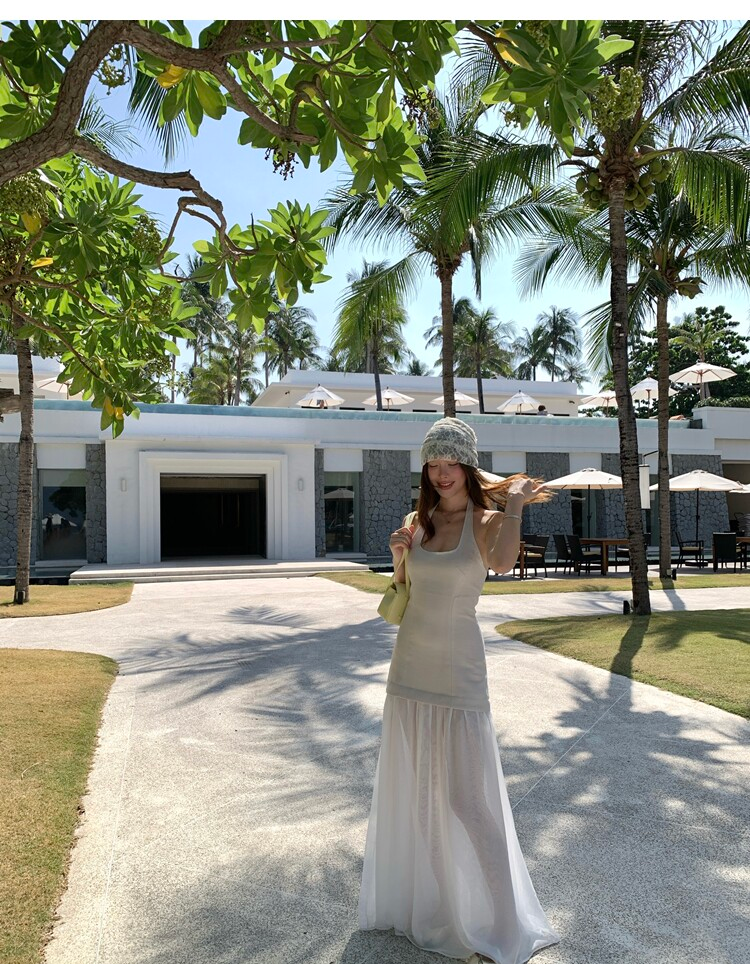 Gallery neckline backless waist-cinching long mesh dress