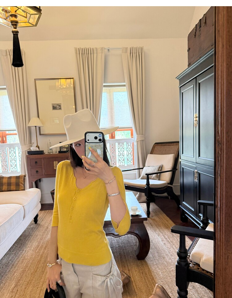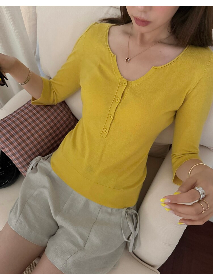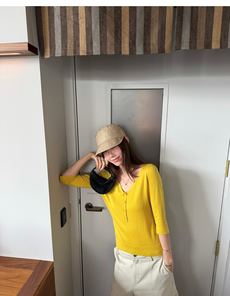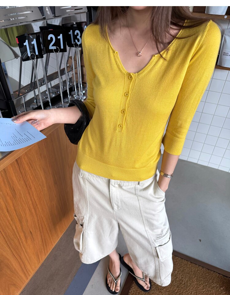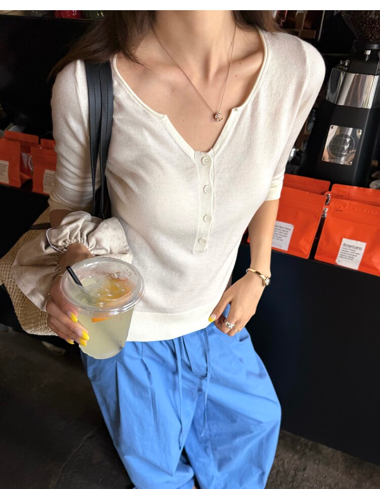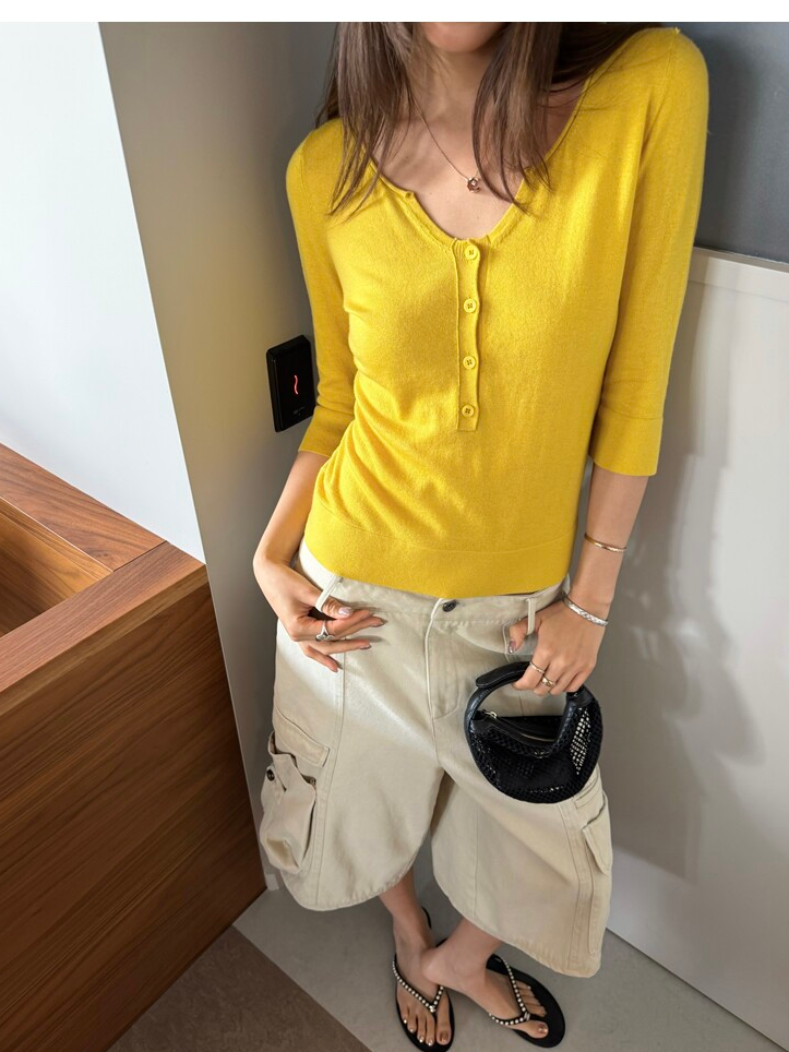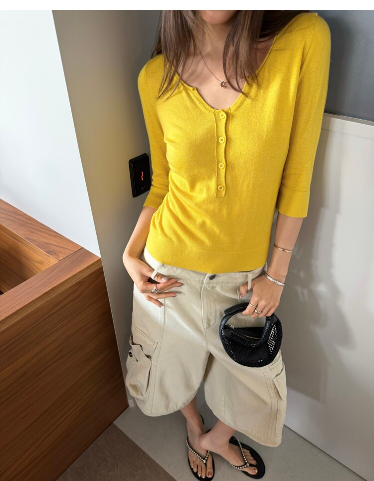Light Lysel Wool Silk Multi-Button Mid-Sleeve Knit Sweater