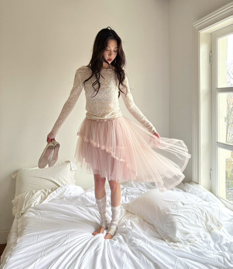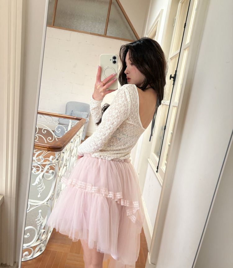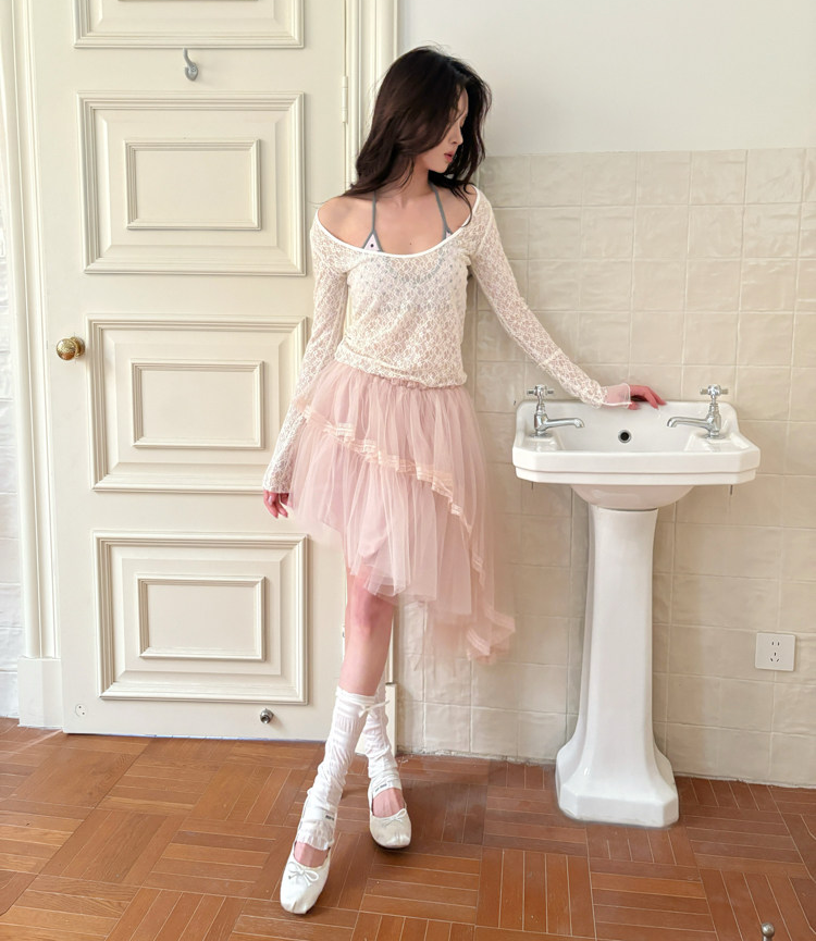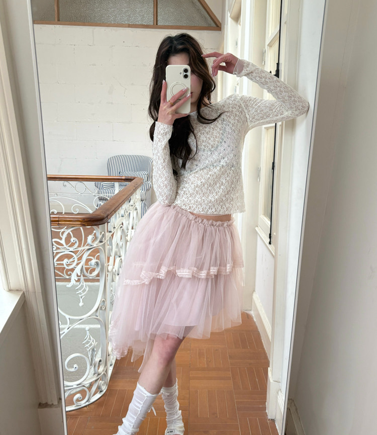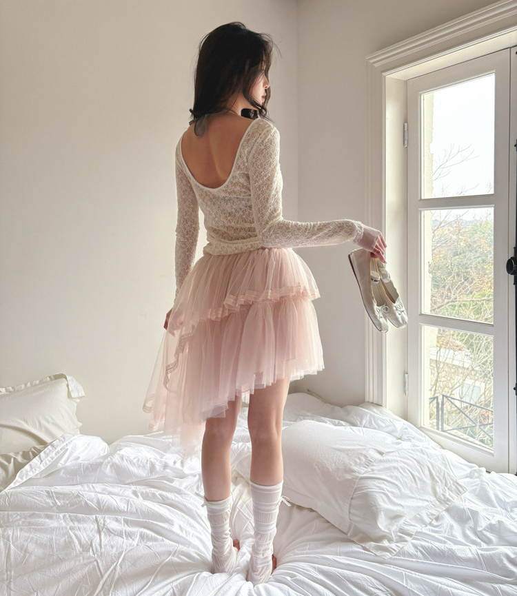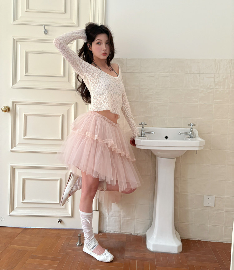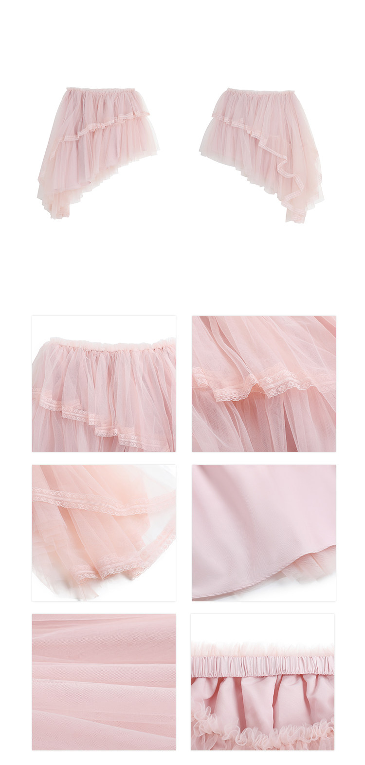 Lace-Mixed High-Quality Fluffy Mesh Half-Sleeve Skirt