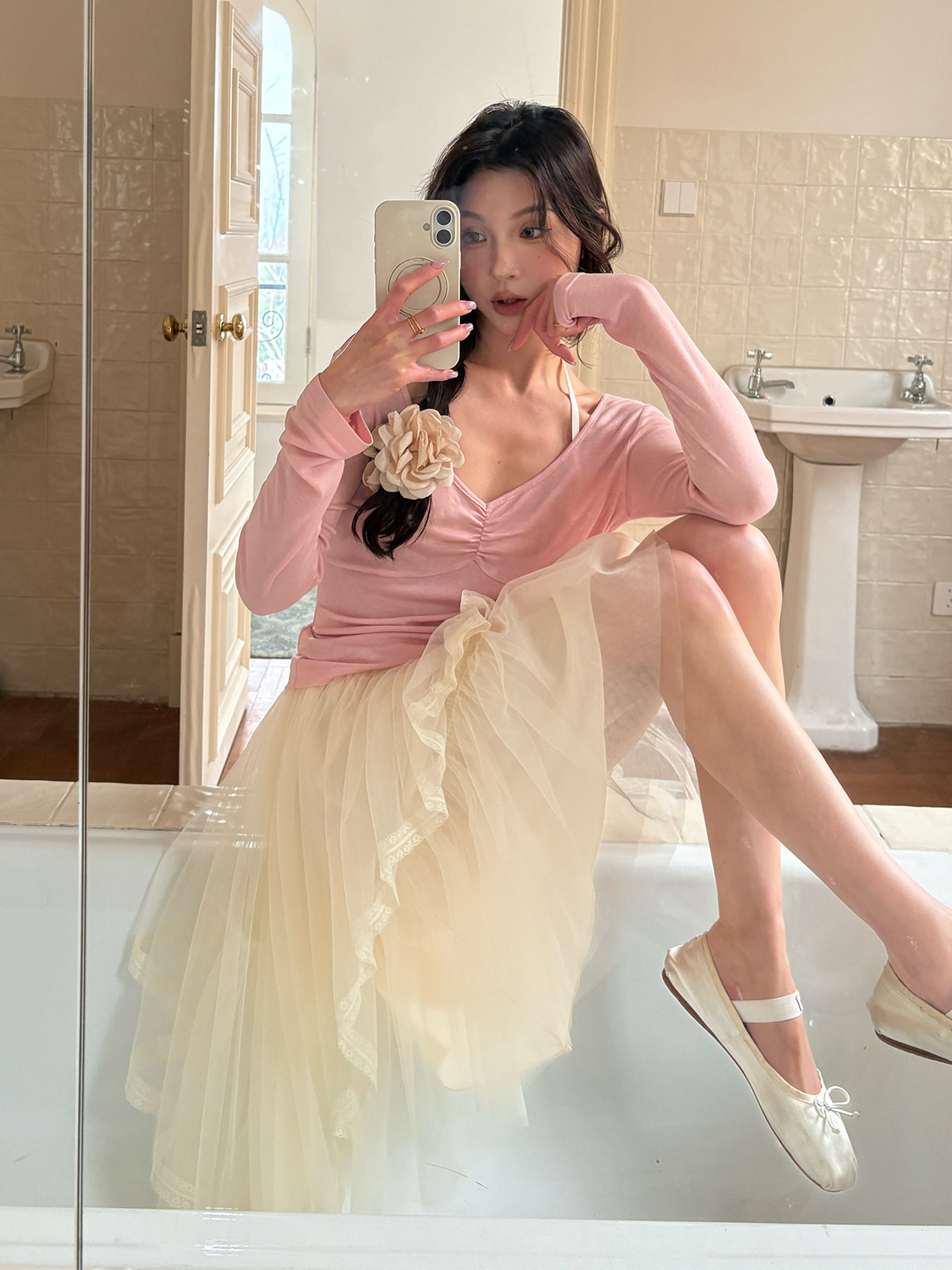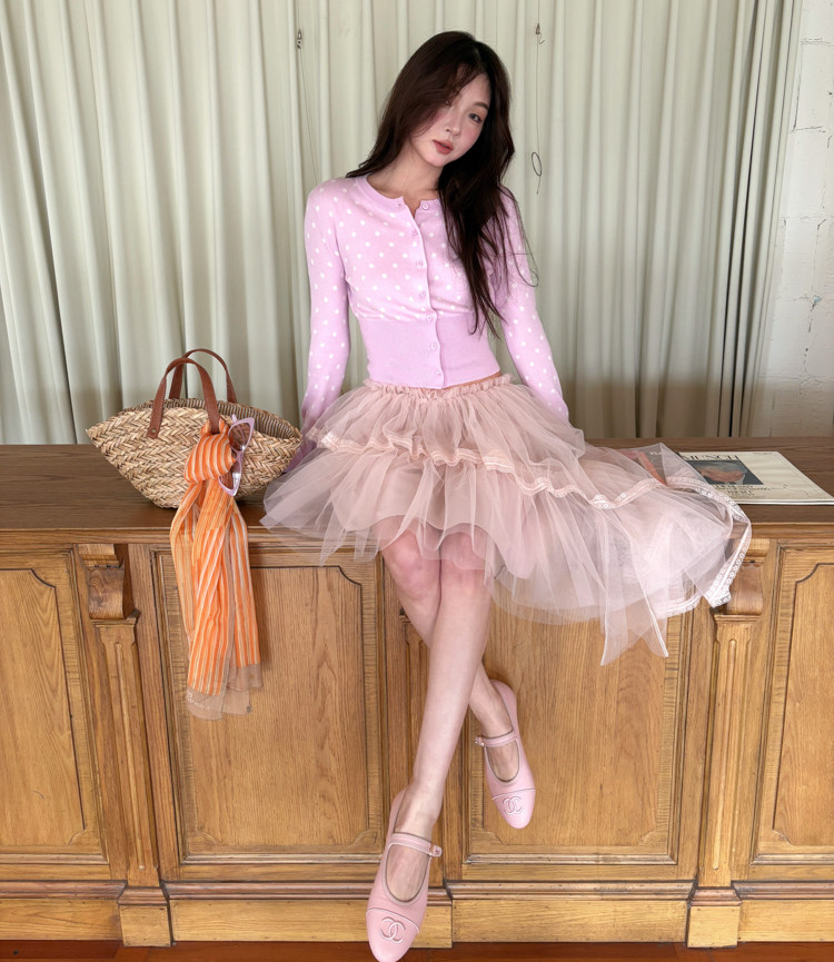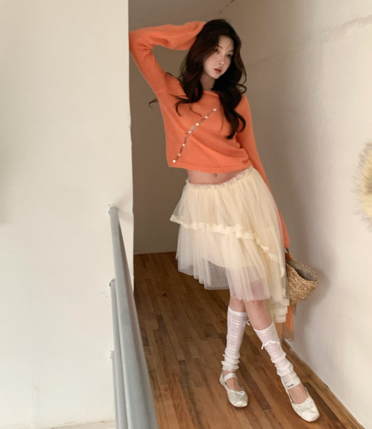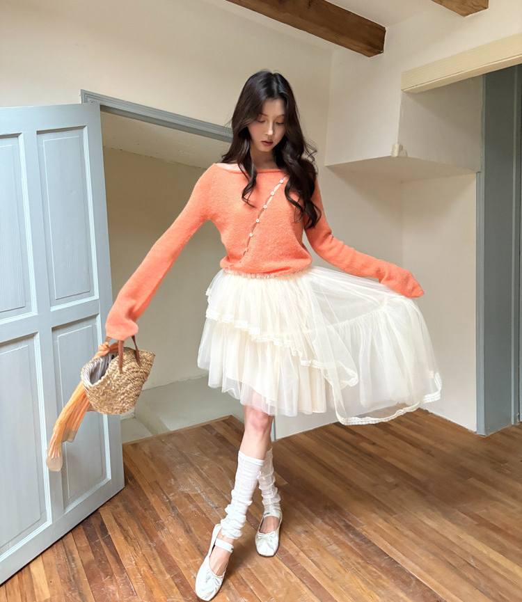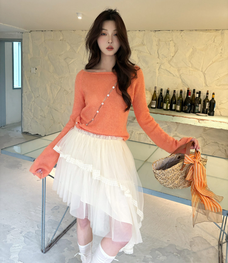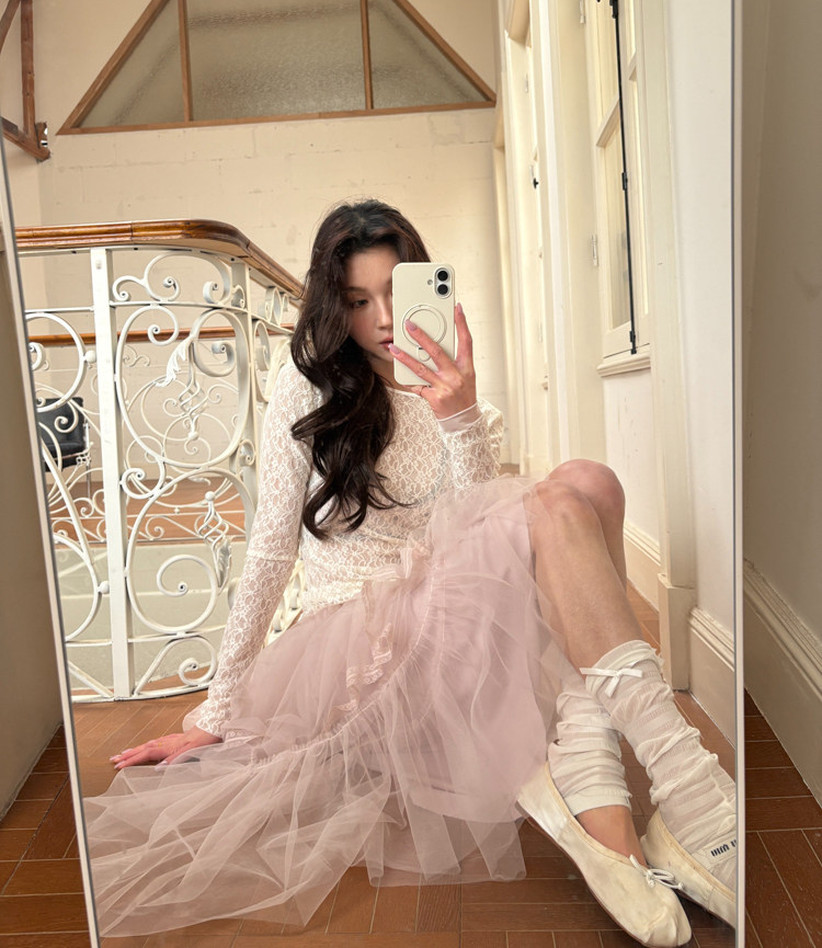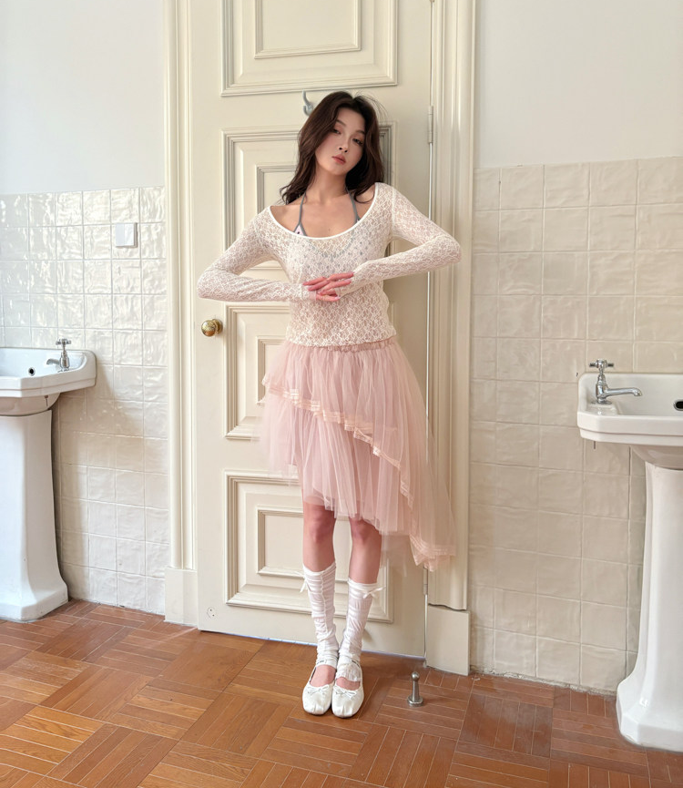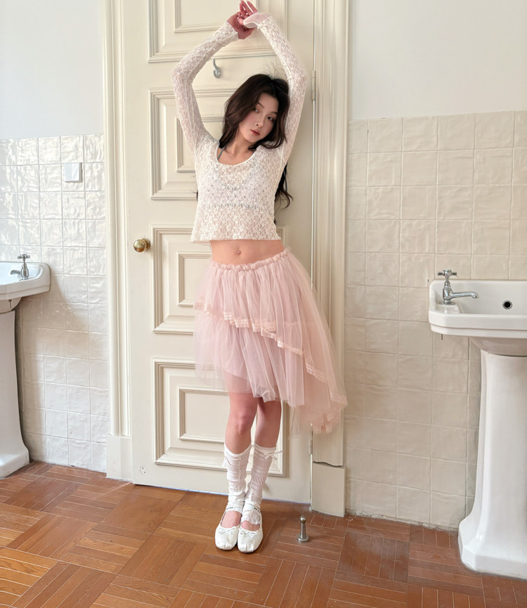 Lace-Mixed High-Quality Fluffy Mesh Half-Sleeve Skirt