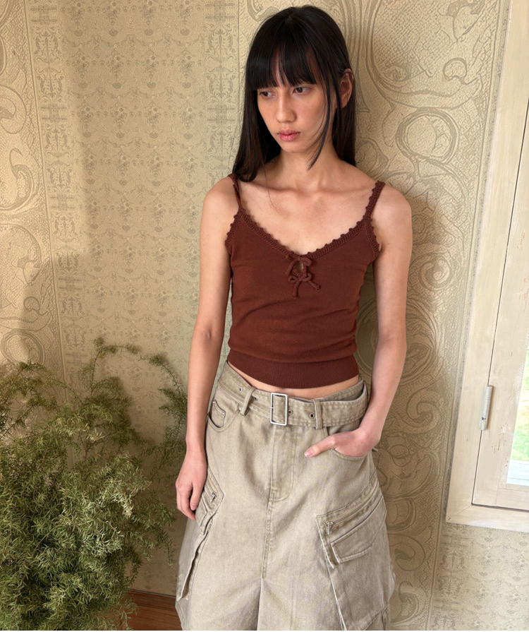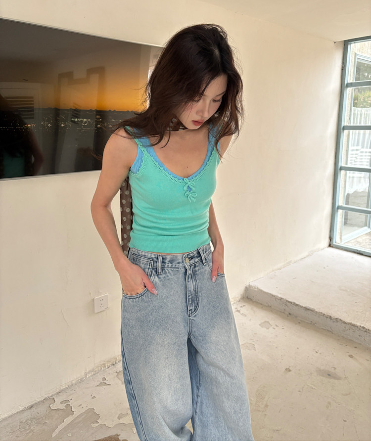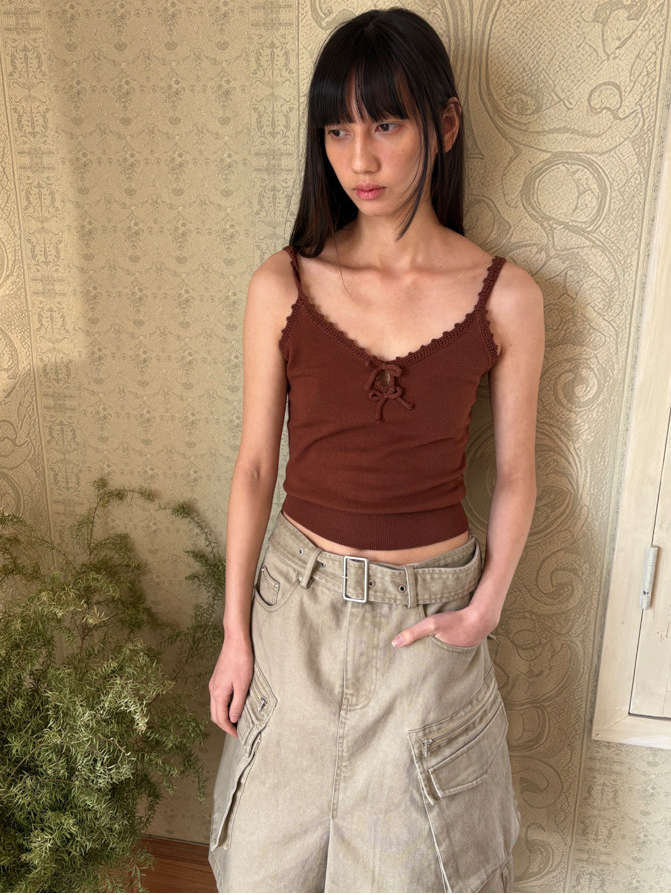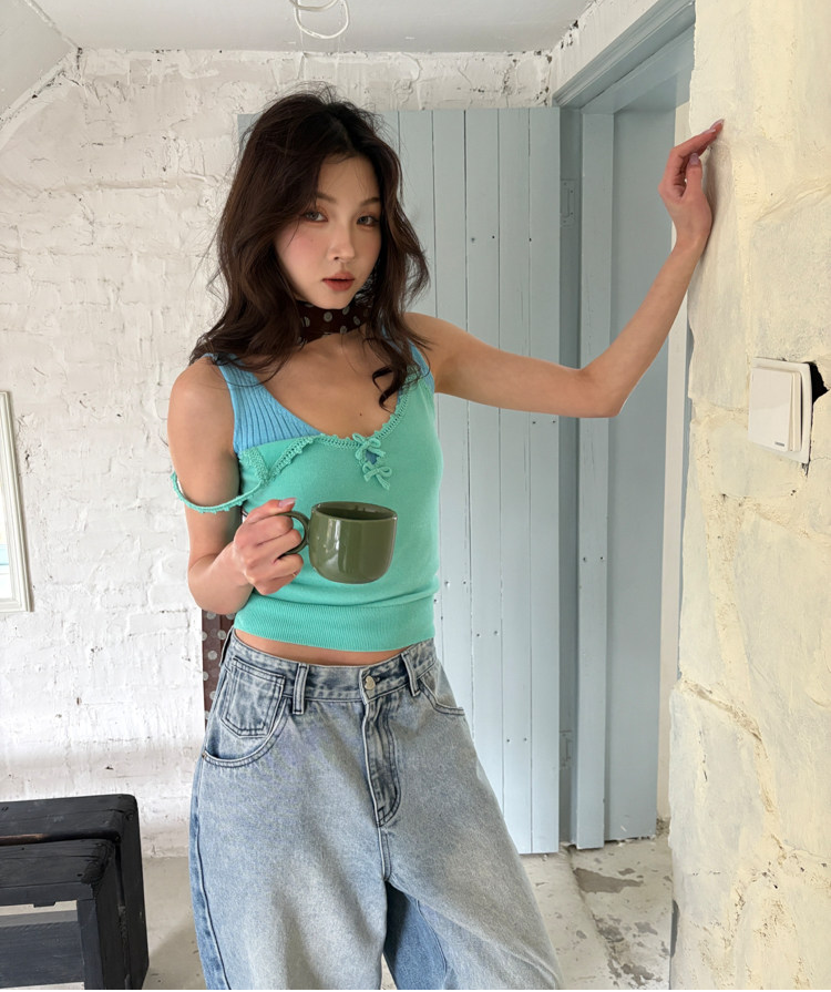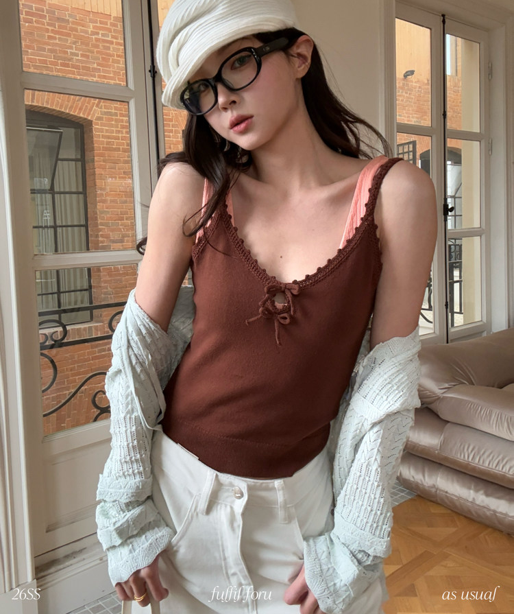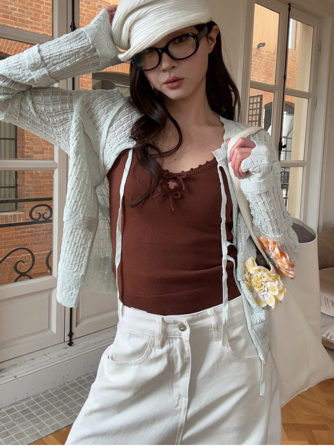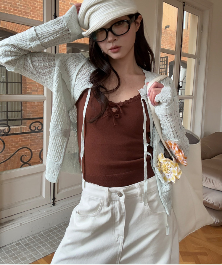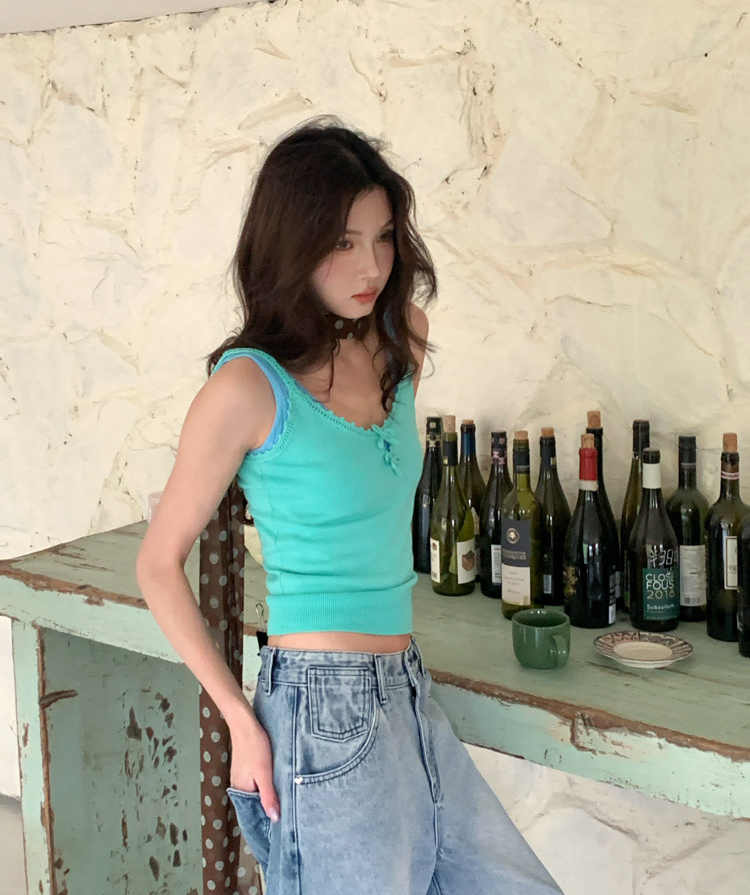 French Retro Handcrafted Edge V-Neck Knit Strap Top